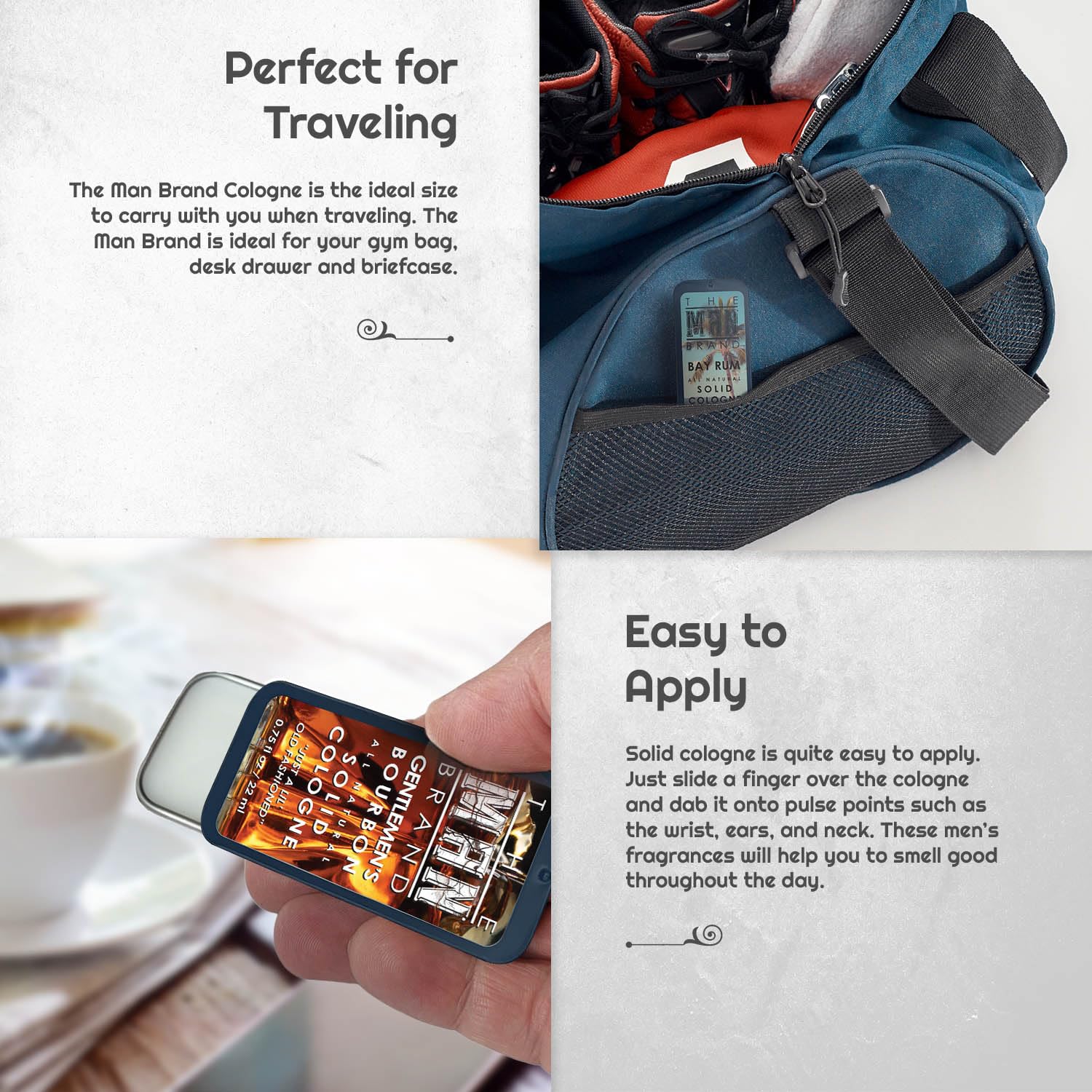 • The Traveler's Essential:Our solid colognes for men is the ultimate travel size mens cologne. Experience the scent touch-ups on the go, without worrying about bulky bottles.
