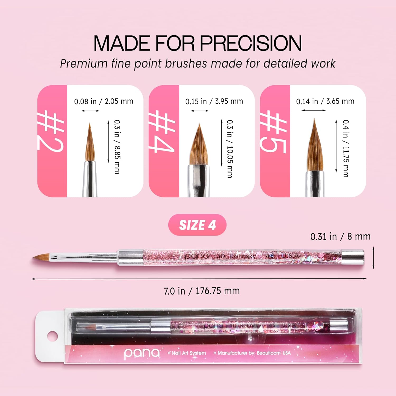 PANA 3D Kolinsky Nail Art Brush - Pink Glitter Handle, Size 4 - Acrylic Nail Art Sculpture Brush for Manicures Pedicure Salon Professional or Beginner
