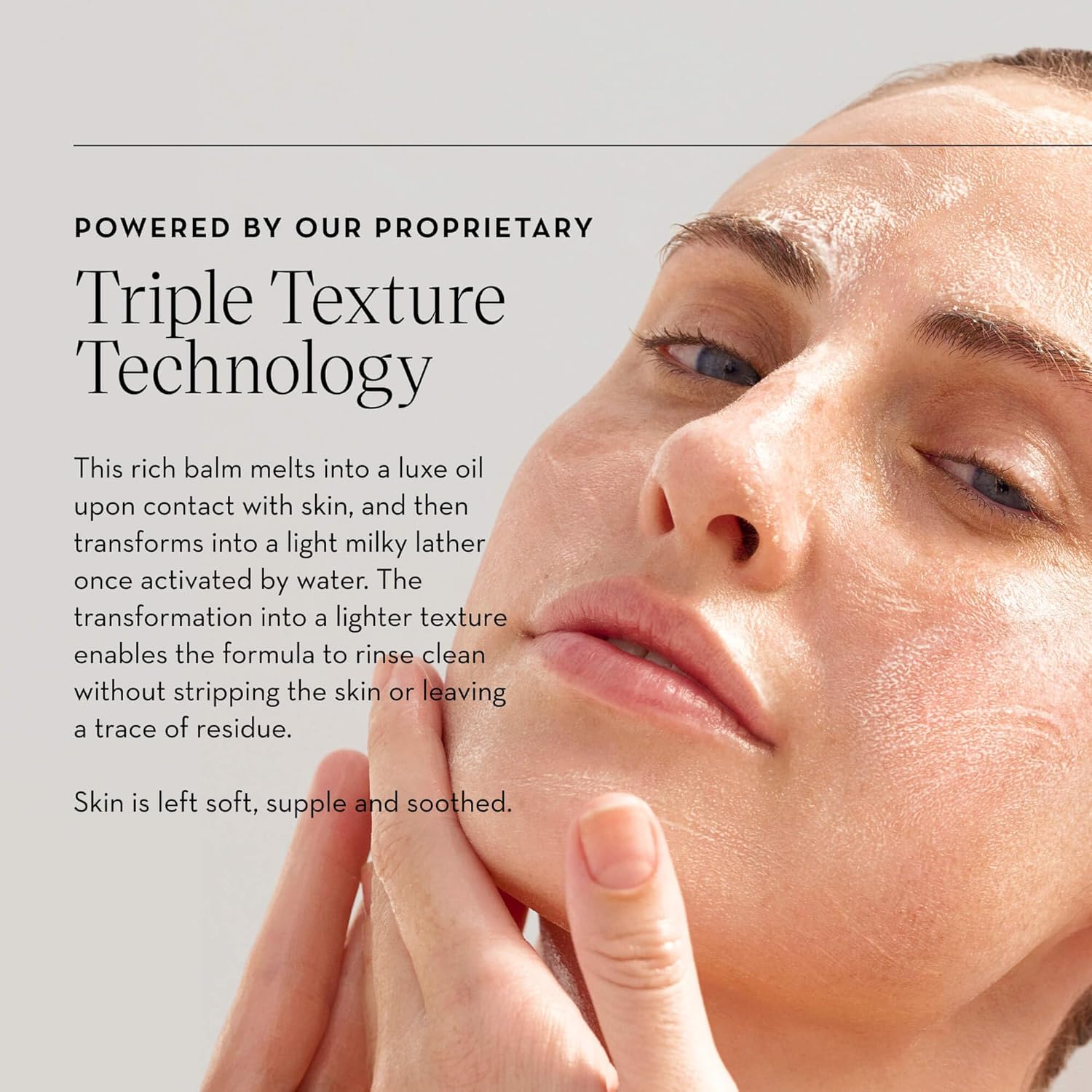 • Triple Texture Technology: Unique formulation transitions from a solid balm to a nourishing oil and then to a light, milky lather, ensuring a residue-free finish.
