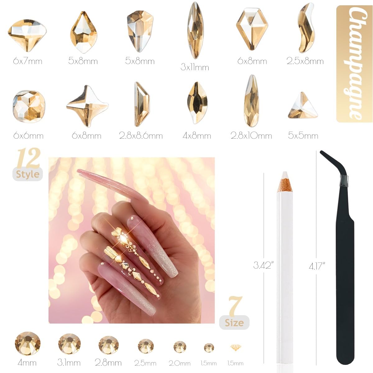 • ❤【Multi-Functions Diamonds Rhinestones & Available Occasions】Champagne Gold nail rhinestones and gems set are very suitable for Wowen: 3D nail art, flat nail art,, DIY slime making, night out, costumes, wedding dress, , Christmas decorations, gift-wrap, ornaments, ceramics, greeting cards, signs, face, nails, computer, cell phone case, invitation card and etc.