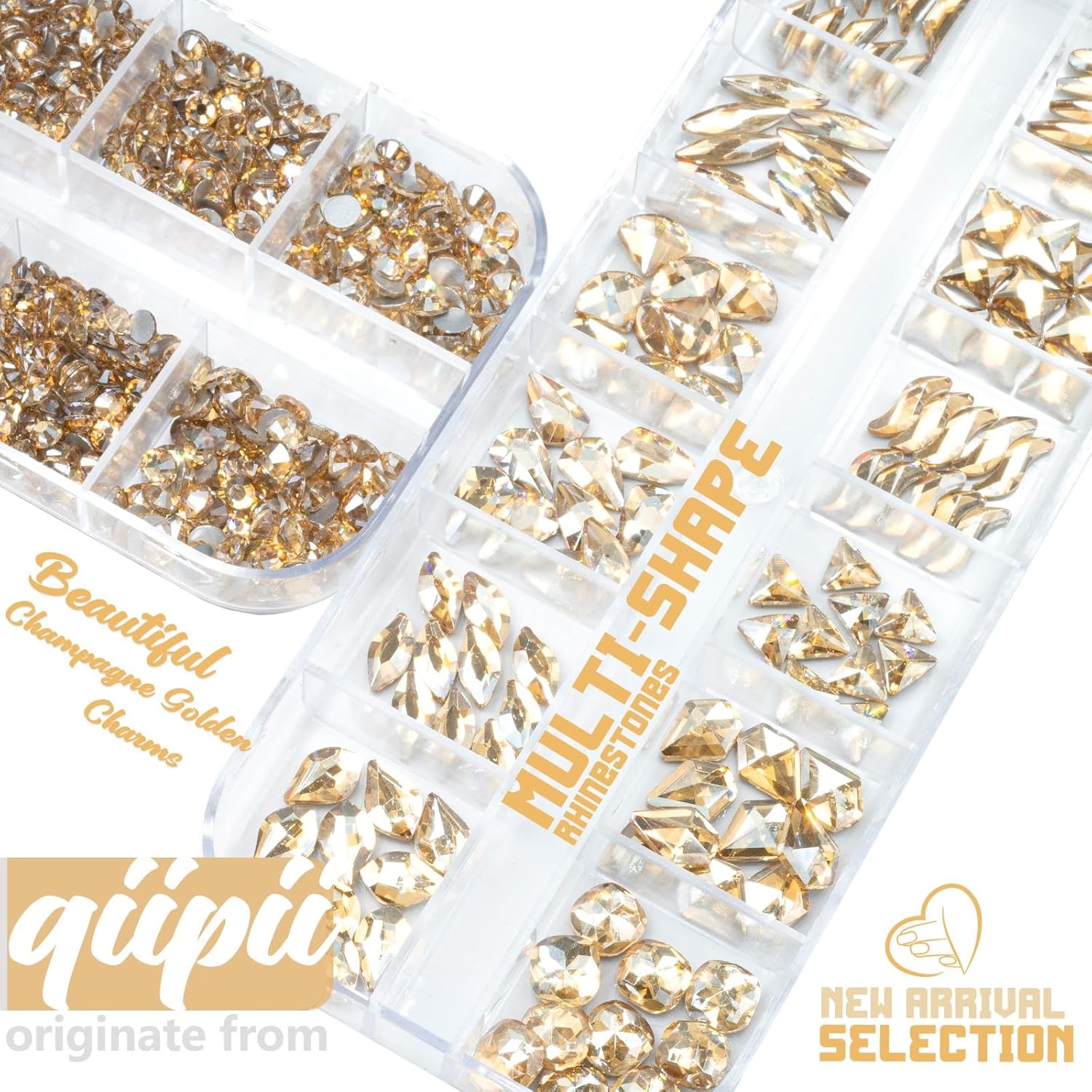 • ❤【2 Boxes 24 Grids Crystal Champagne Gold Nail Rhinestones + Stainless Steel Tweezer + Pickup Pen】qiipii 4080Pcs sparkling Champagne Gold rhinestones nail crystals. Including 120pcs multi-shaped crystal rhinestones, 3960pcs multi-sized round crystal gem rhinestones. Enough amounts and more shape options for your daily work, go out or other decoration purposes. Comes with 1 Stainless Steel Tweezer and Pickup Pen for Manicure DIY Decoration at Home Salon Supplies.