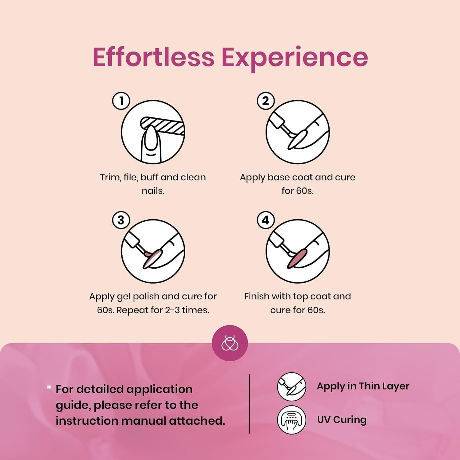 • Speed Curing with LED Nail Lamp: The gel nail polish set needs to be cured under an LED Dryer Lamp. Base and Top coat required. Average for an LED Lamp is 60-120 secs.