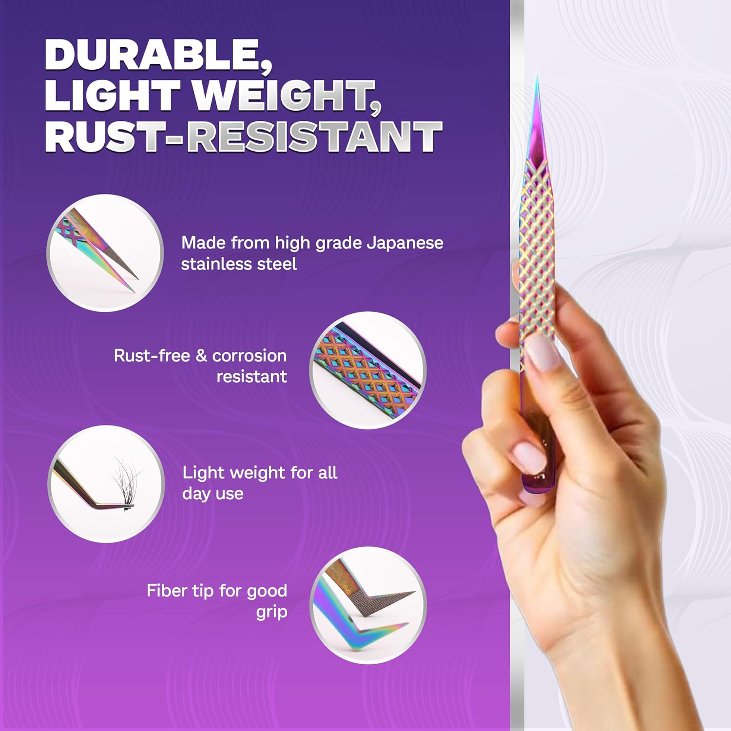 • Ultra fine fiber tips for maximum precision engineered with fiber tips that securely grip even 0.03mm lashes without slipping. These volume lash tweezers are ideal for creating fans, isolating lashes, and applying classic or volume eyelash extensions with accurate precision