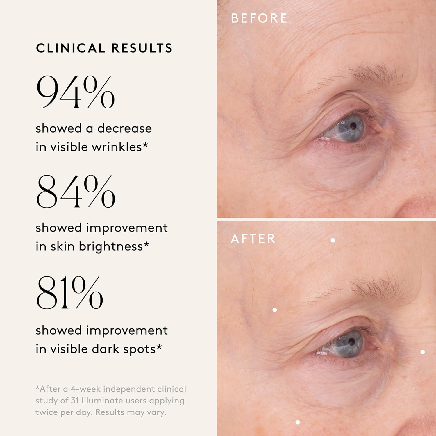 • CLINICAL RESULTS: After a 4-week independent clinical study of 31 Illuminate users, 94% showed a decrease in the appearance of fine lines & wrinkles, 84% improved visible skin radiance, and 100% showed an increase in hydration.*
