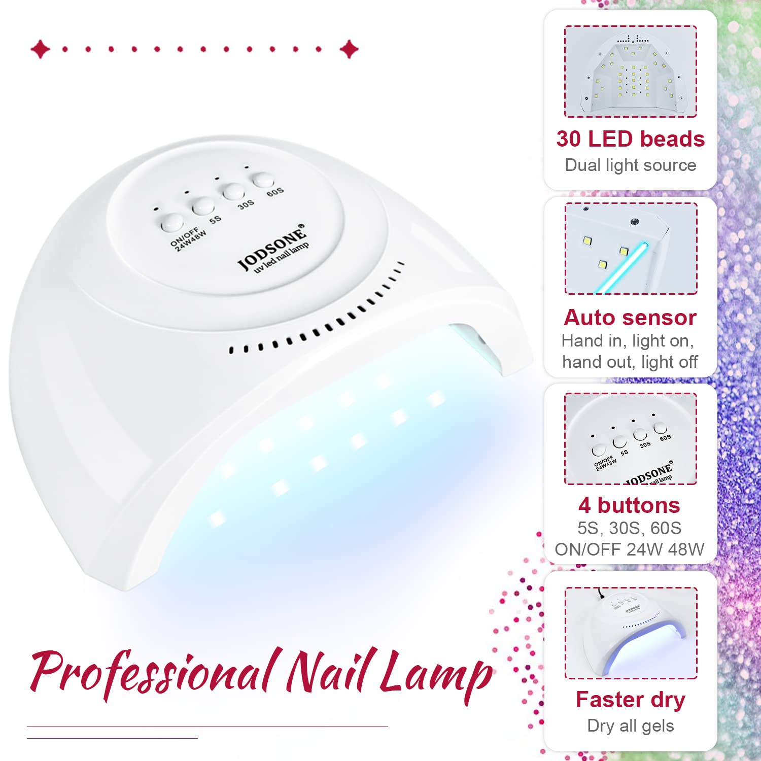 • Smart Nail Lamp: This manicure lamp has 30 small led beads, which can cure every finger comprehensively. Large space, you can put two hands at a time. And it has three curing modes, 5 seconds, 30 seconds and 60 seconds. Generally, under normal circumstances, gel nail polish can be quickly cured within one minute. But the cure time also depends on the amount of gel nail polish. With the nail lamp and correct operation, gel nail polish generally lasts for about 21 days..