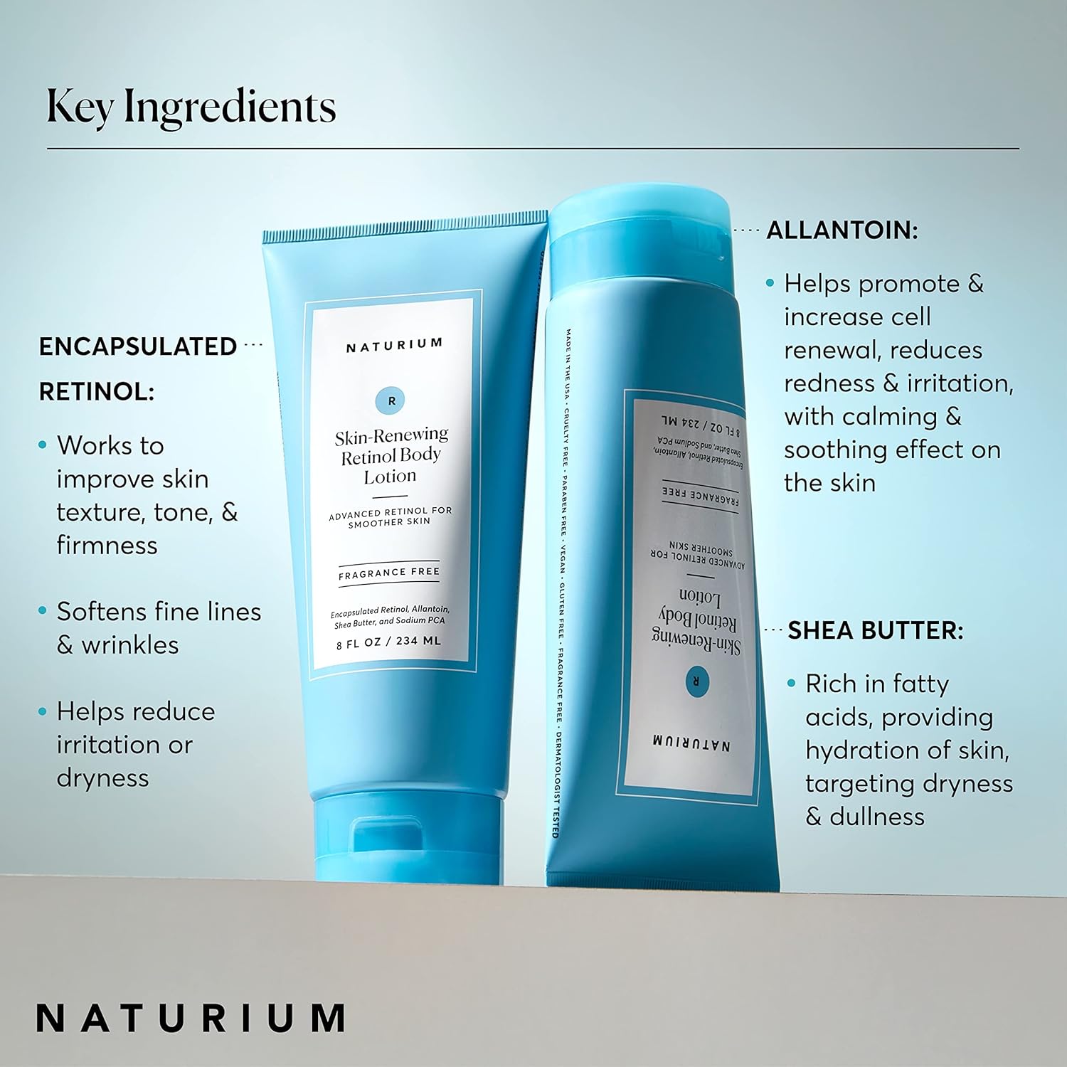 • ANTI-AGING BODY CARE: A nourishing body lotion that moisturizes and renews. Our Retinol Body Lotion promotes skin renewal, working to improve skin texture, tone, and firmness. This lotion leaves skin feeling soft, supple, and nourished