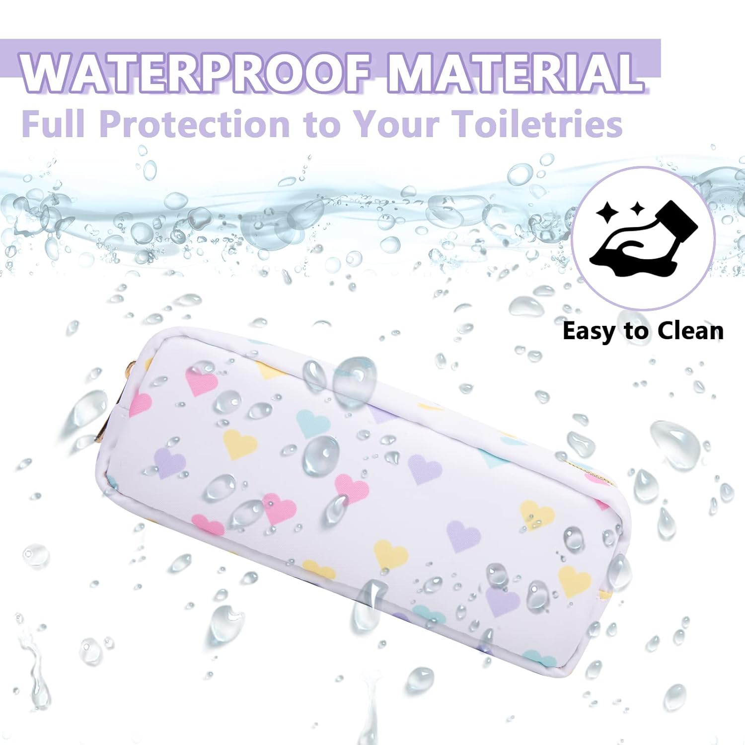• 【Multiple Options】The waterproof makeup bag has four sizes, Mini(4.75''*2''*5''), Small(9.5''*2''*5''), Large(11''*5''*8'') and Slim(2.75*8''*2.75''). You can choose the right size according to the items you want to store. We have four types of patterns, Pink Heart, Houndstooth, Checkerboard grid and White Heart. You can enjoy choosing the pattern you like.