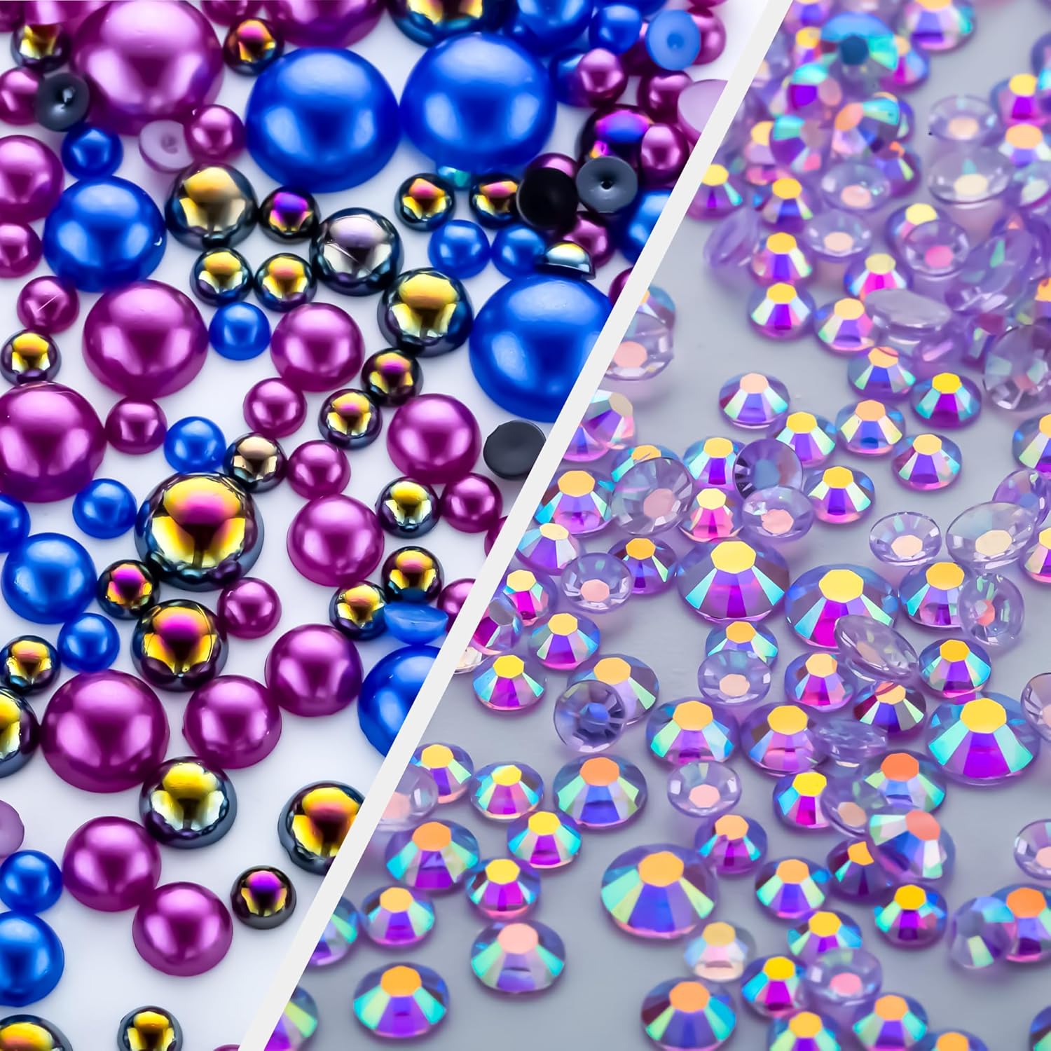 • Assortment Sizes: The flatback half pearls come in a mixture of colors and sizes of 3/4/5/6/8/10mm. The flatback rhinestones are resin rhinestones in sizes of 2/3/4/5/6mm. These mixes are such a great way to get an assortment of colors and sizes without having to buy each item individually