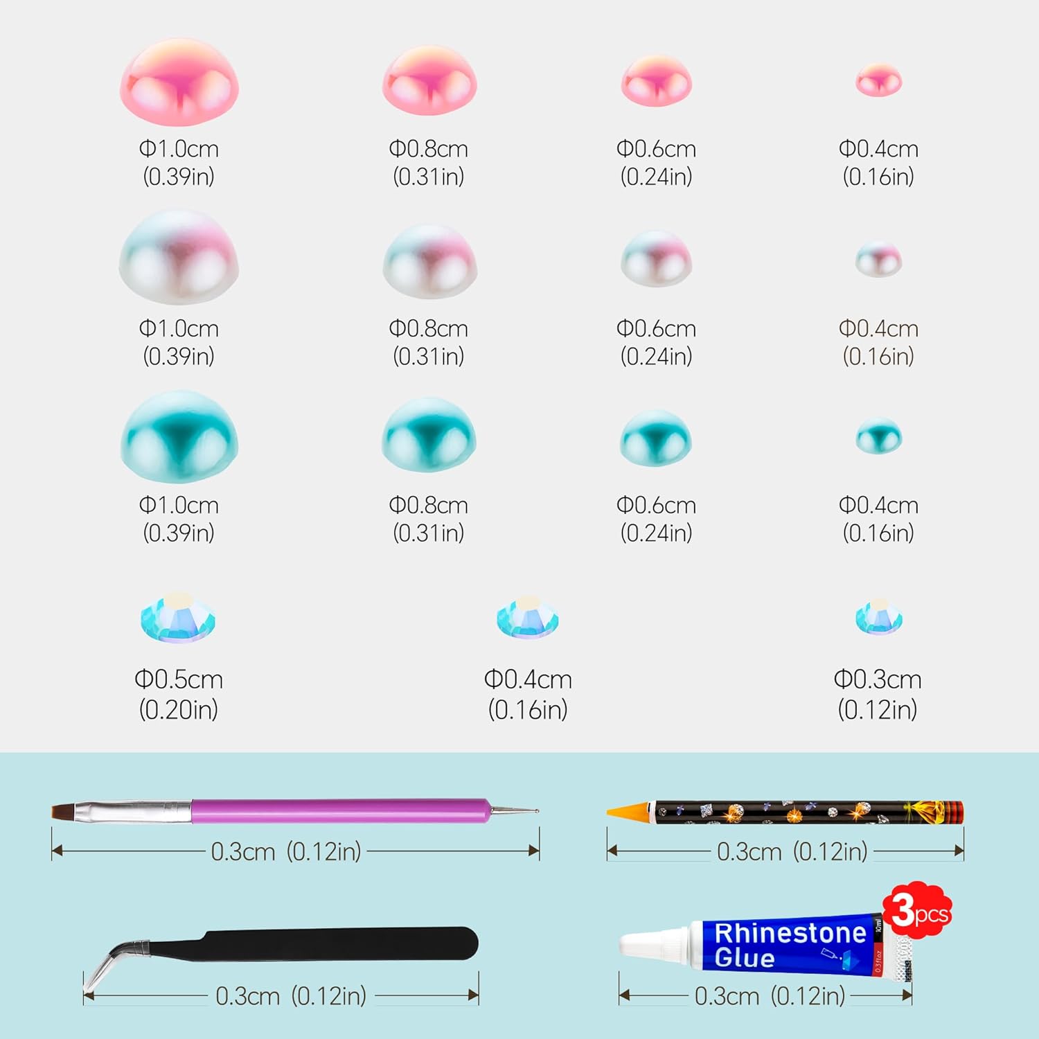 60g Cyan Pink Flat Back Pearls Rhinestones for Crafts Mixed Size 3mm-10mm AB Color Round Half Pearls Flatback Pearl Beads and Resin Rhinestones Set for Face Art with Gel