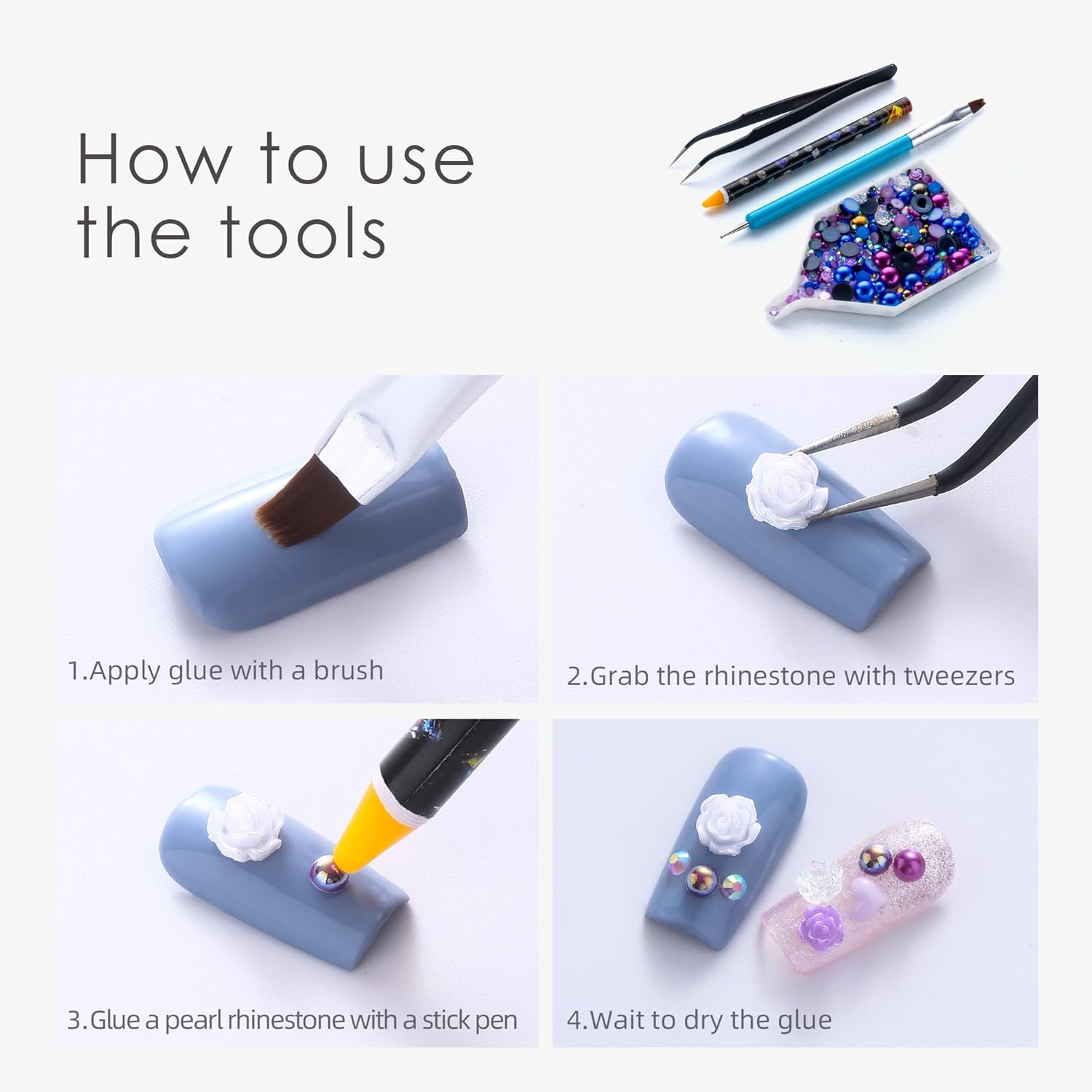 • Useful tools - These pearls and rhinestones have a flat back, which is excellent for easy placement.and you can pick up any large or small pearls and rhinestones with the crayons we bring along. And use the brush to smooth out the Gel, these tools will work very well