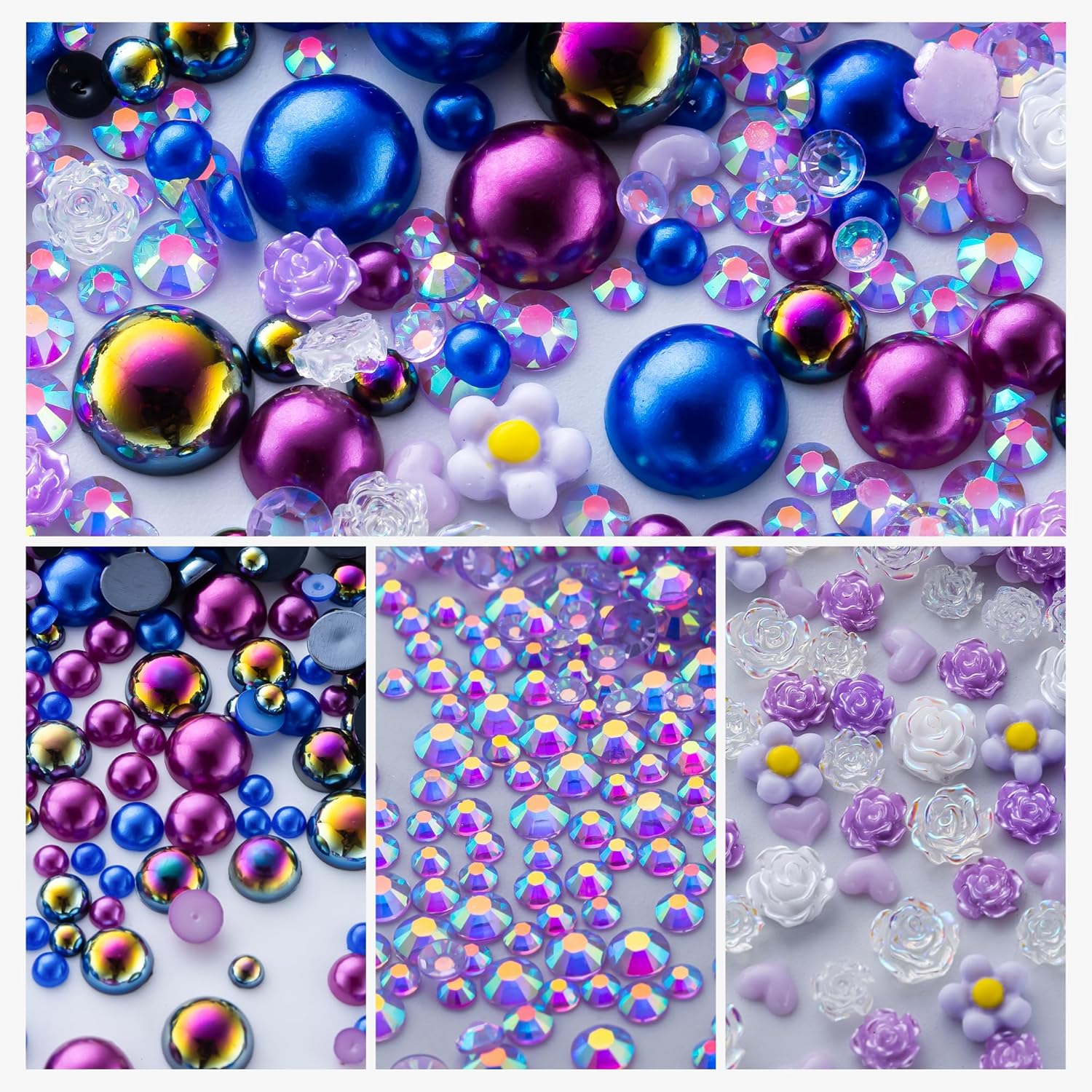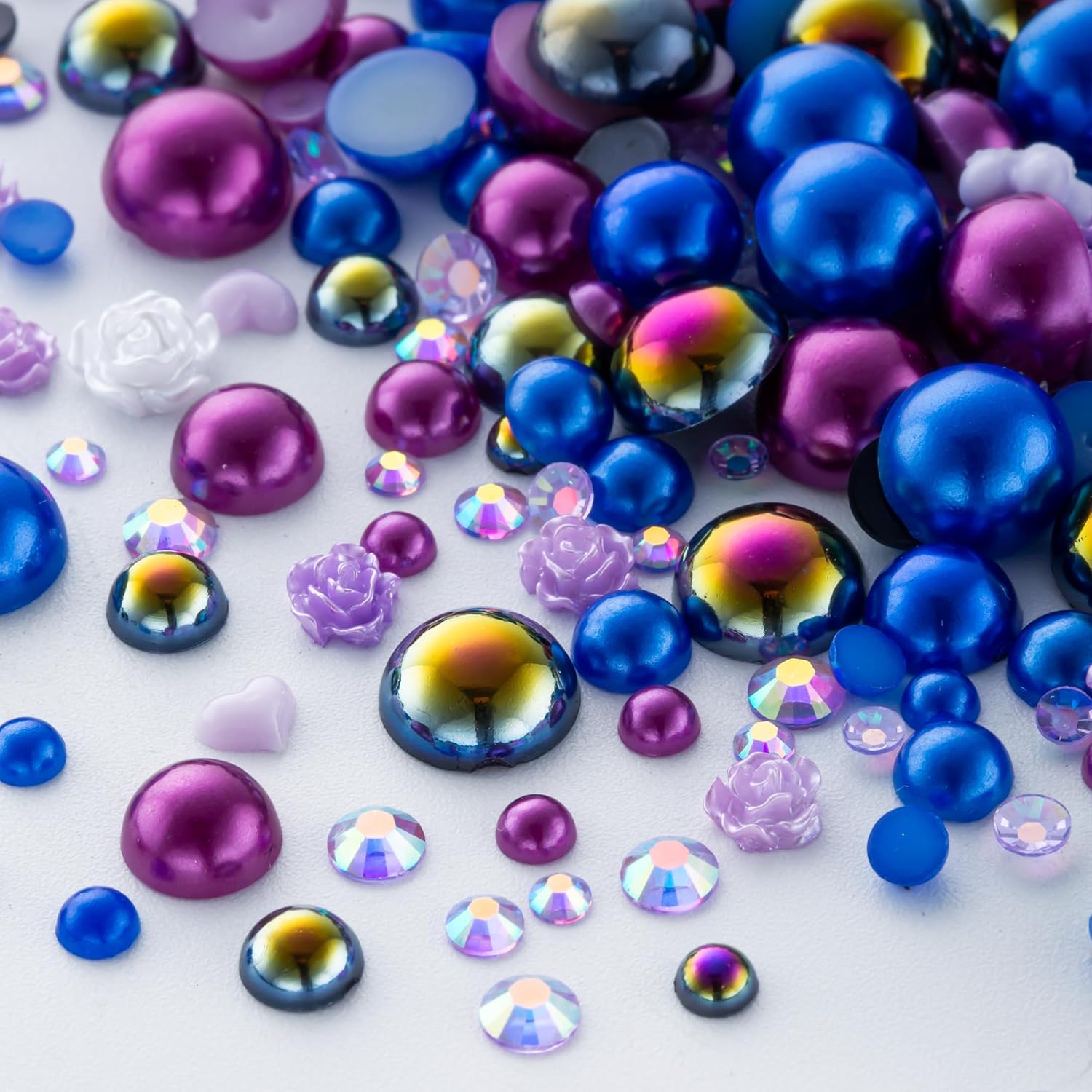 160g Dark Blue Flat Back Pearls Rhinestones for Crafts Mixed Size 3mm-10mm AB Color Round Half Pearls Flatback Pearl Beads and Resin Rhinestones Set for Face Art