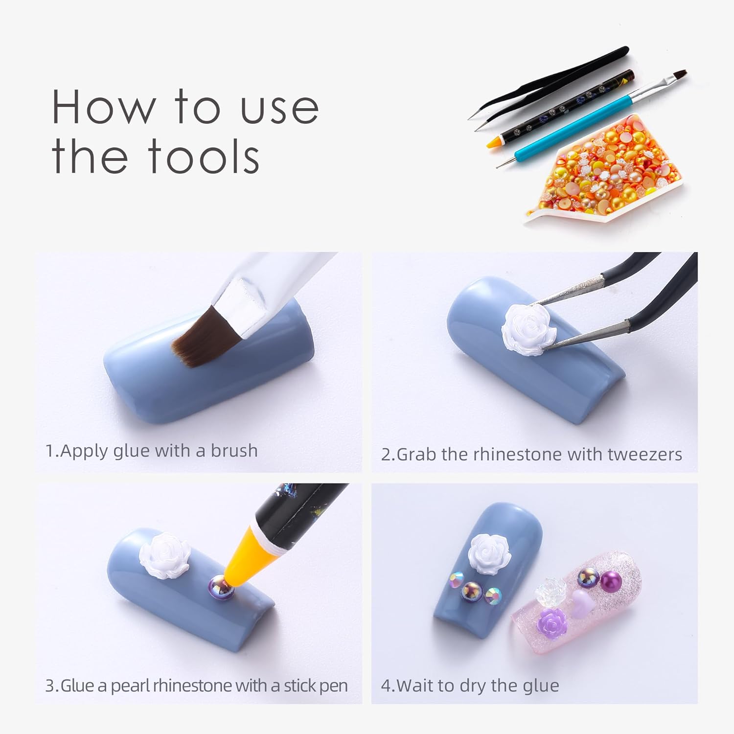 • Useful tools - These pearls and rhinestones have a flat back, which is excellent for easy placement.and you can pick up any large or small pearls and rhinestones with the crayons we bring along. And use the brush to smooth out the Gel, these tools will work very well