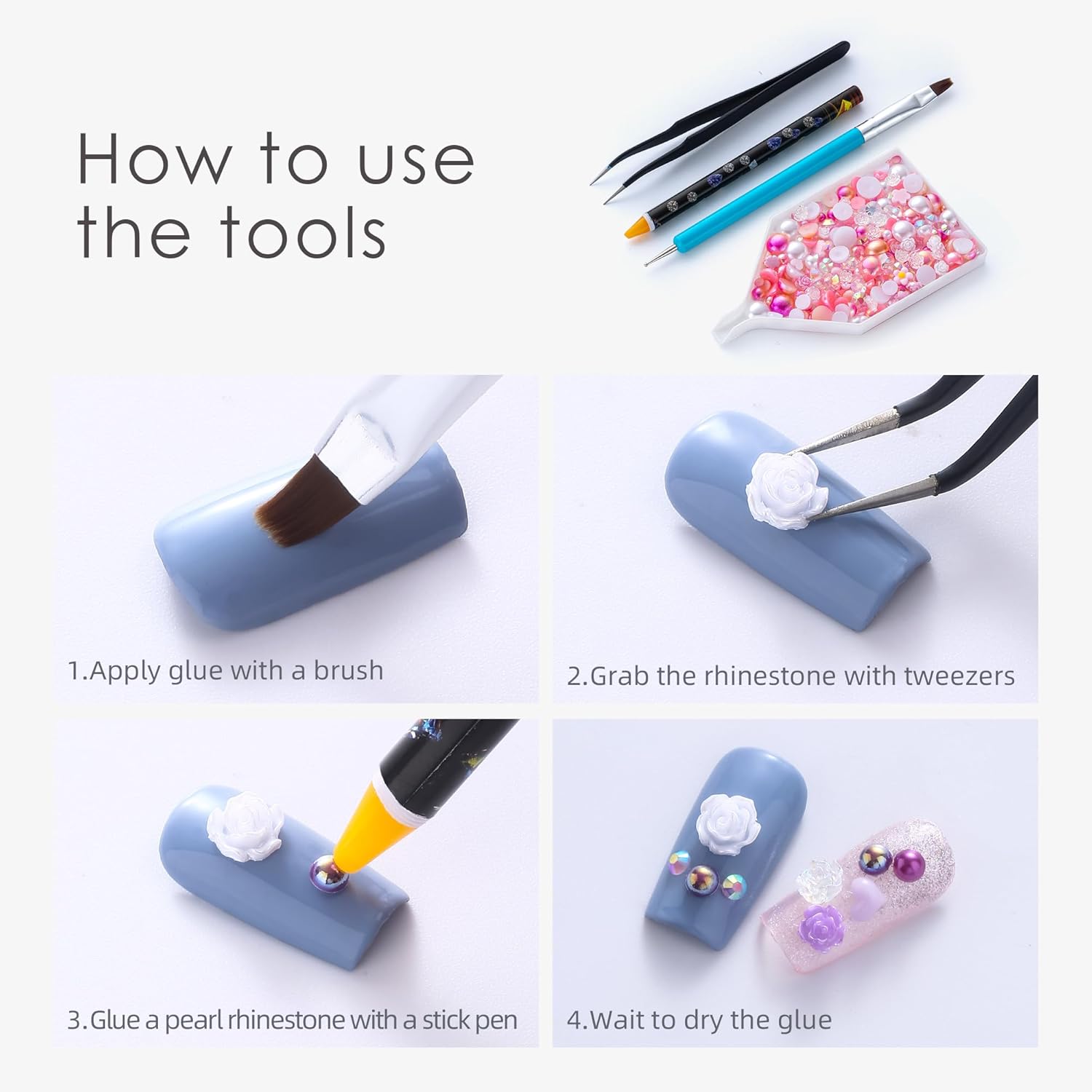 • Useful tools - These pearls and rhinestones have a flat back, which is excellent for easy placement.and you can pick up any large or small pearls and rhinestones with the crayons we bring along. And use the brush to smooth out the Gel, these tools will work very well