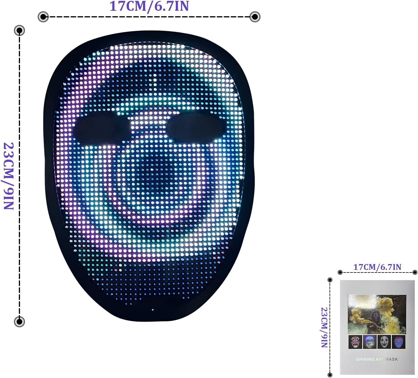• Shining Mask Has 45 Dynamic Display Modes And 70 Static Display Images,Led Mask Can Be Set To Single Color,Flash,Gradient,Smooth And Multi-Color.After Connecting To The Led Mask Using Bluetooth-compatible,It Can Be Programmed Through The SHINING MASK APP.