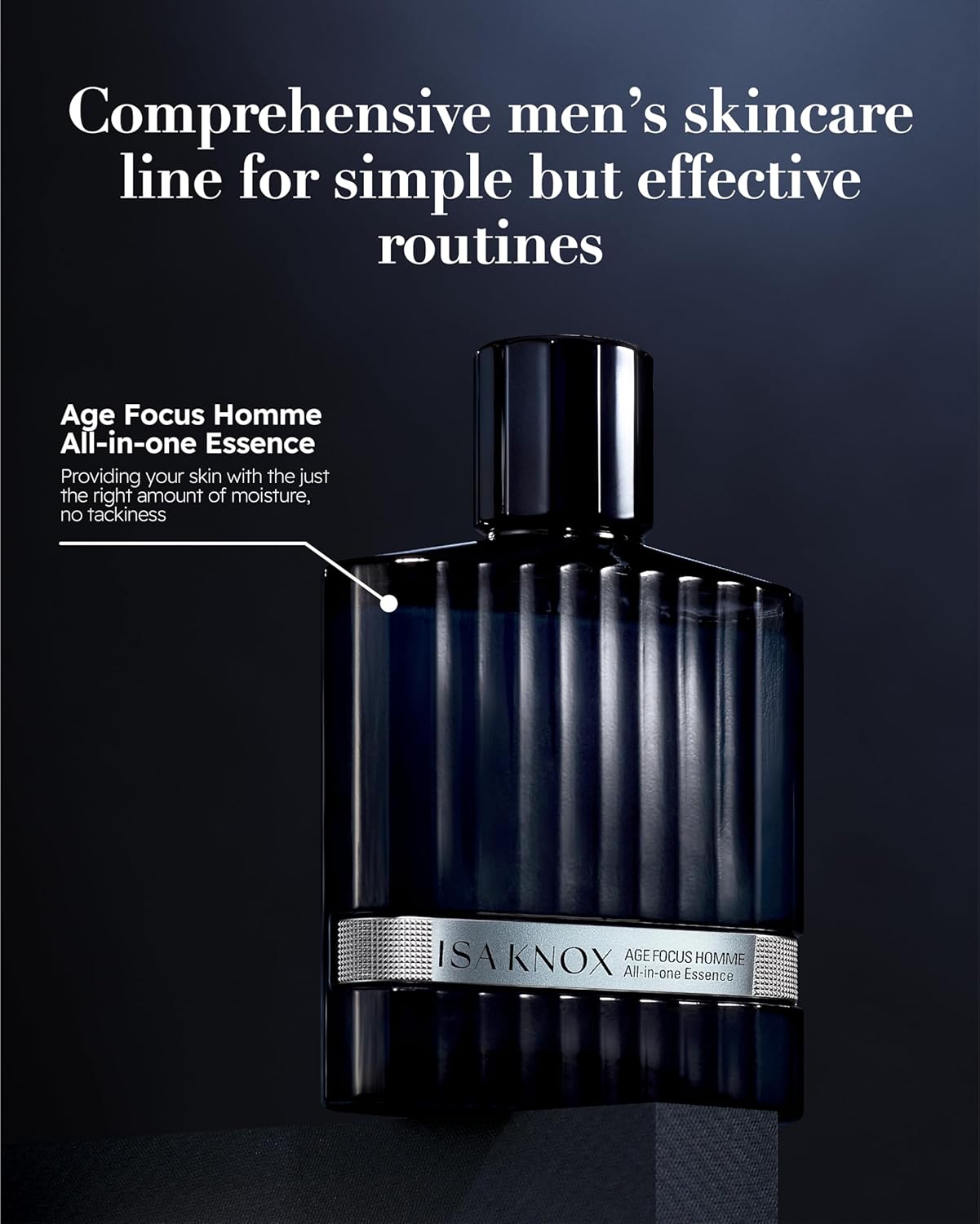 • ISA KNOX AGE FOCUS HOMME ALL-IN-ONE ESSENCE (120ml/4.1fl oz) provides the ultimate solution for a comprehensive and effective daily skin care for men by forming a refreshing and moisturizing barrier, maintaining long-lasting hydration for your skin.
