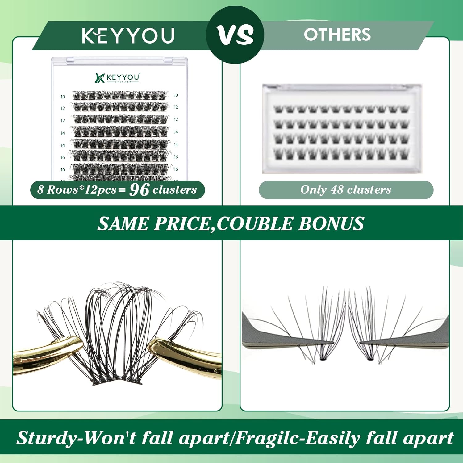 • 【Soft&Comfortable】KEYYOU lash cluster are made of imported materials,the stem line is thinner and softer, the eyelash cluster are lighter and more comfortable to wear.96 clusters in one tray ,more cost-effective.