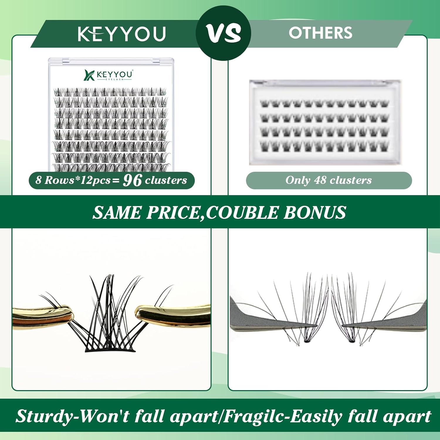 • 【Soft&Comfortable】KEYYOU lash cluster are made of imported materials,the stem line is thinner and softer, the eyelash cluster are lighter and more comfortable to wear.96 clusters in one tray ,more cost-effective.