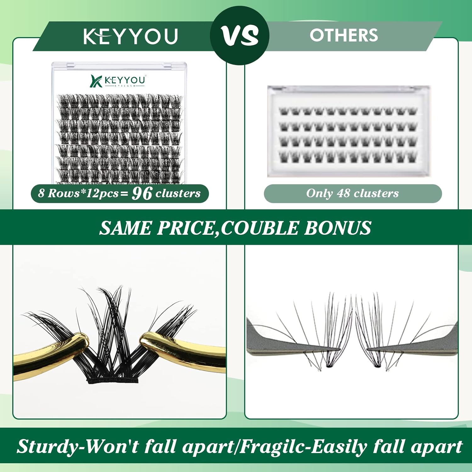 • 【Soft&Comfortable】KEYYOU lash cluster are made of imported materials,the stem line is thinner and softer, the eyelash cluster are lighter and more comfortable to wear.96 clusters in one tray ,more cost-effective.