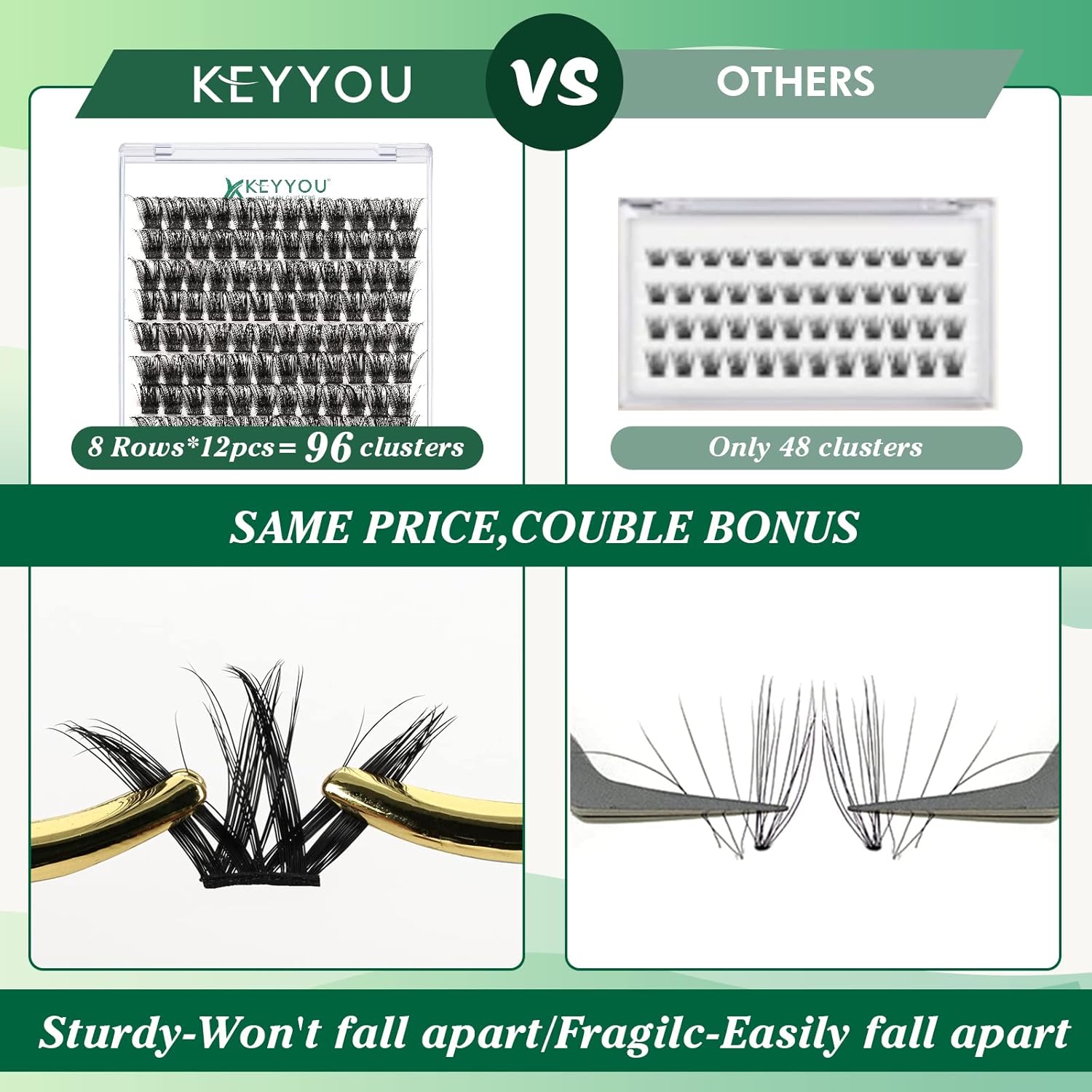 • 【Soft&Comfortable】KEYYOU lash cluster are made of imported materials,the stem line is thinner and softer, the eyelash cluster are lighter and more comfortable to wear.96 clusters in one tray ,more cost-effective.