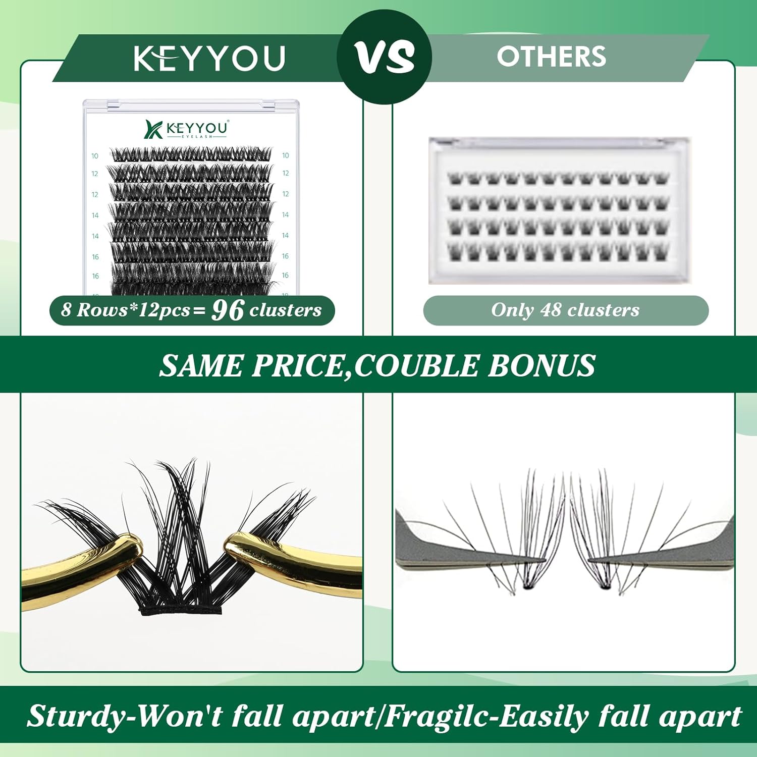 • 【Soft&Comfortable】KEYYOU lash cluster are made of imported materials,the stem line is thinner and softer, the eyelash cluster are lighter and more comfortable to wear.96 clusters in one tray ,more cost-effective.