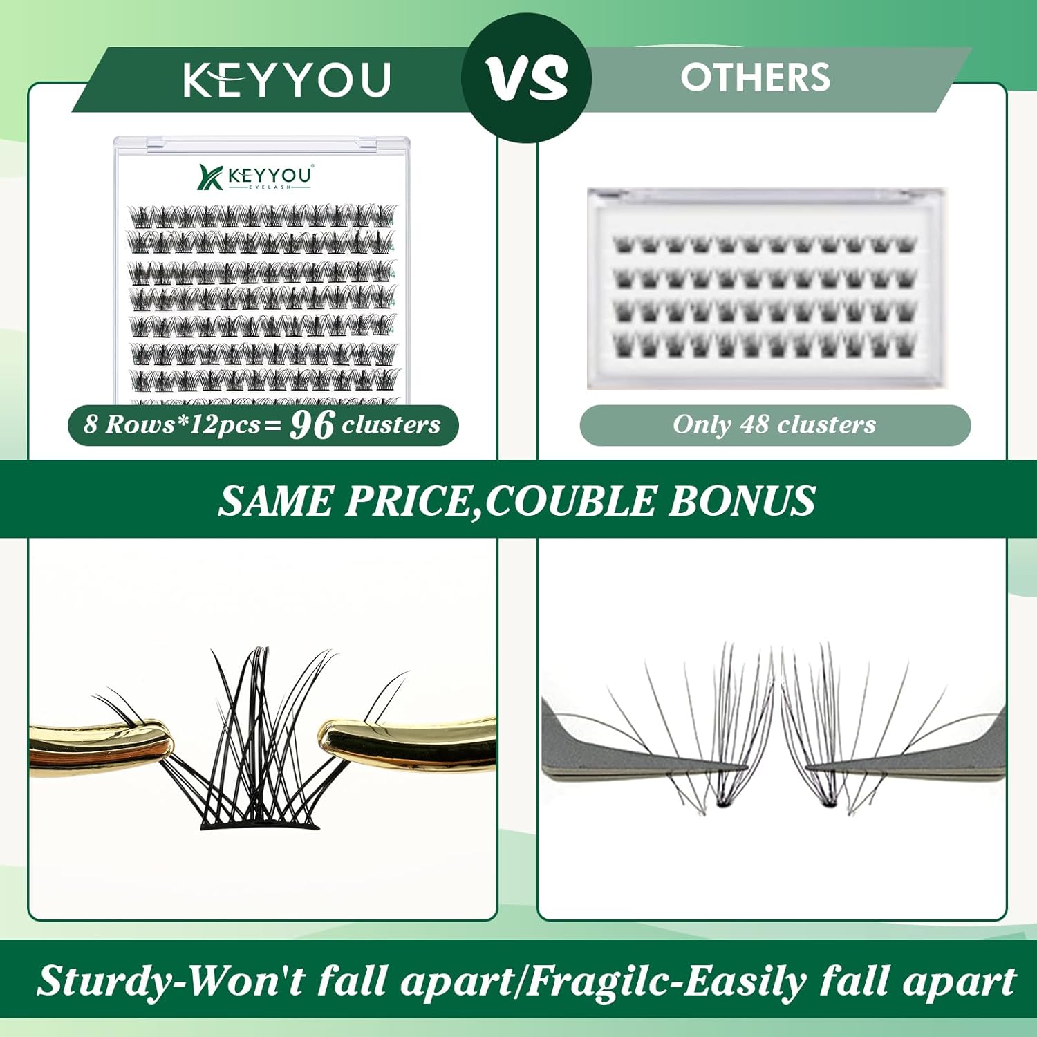 • 【Soft&Comfortable】KEYYOU lash cluster are made of imported materials,the stem line is thinner and softer, the eyelash cluster are lighter and more comfortable to wear.96 clusters in one tray ,more cost-effective.