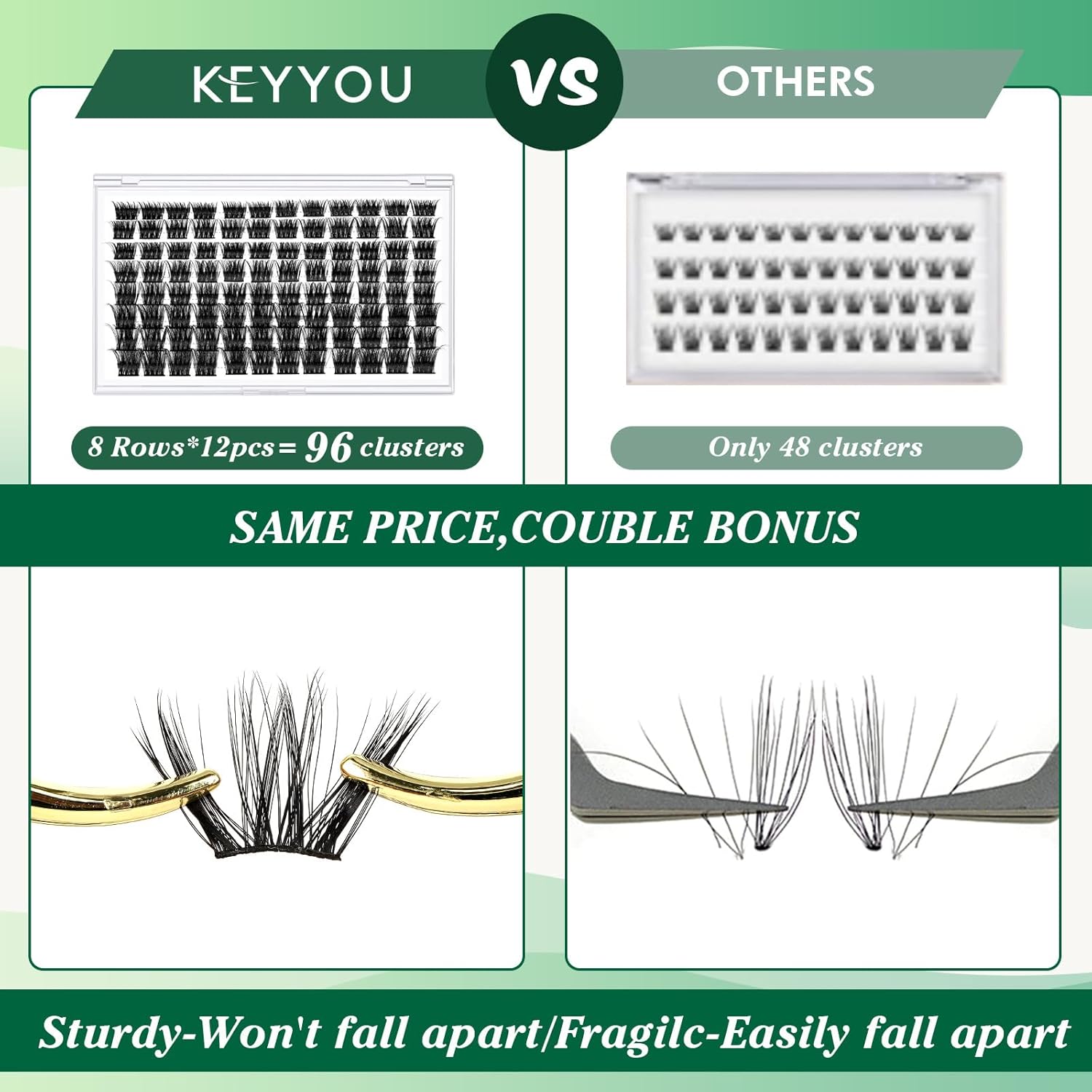 • 【Soft&Comfortable】KEYYOU lash cluster are made of imported materials,the stem line is thinner and softer, the eyelash cluster are lighter and more comfortable to wear.96 clusters in one tray ,more cost-effective.