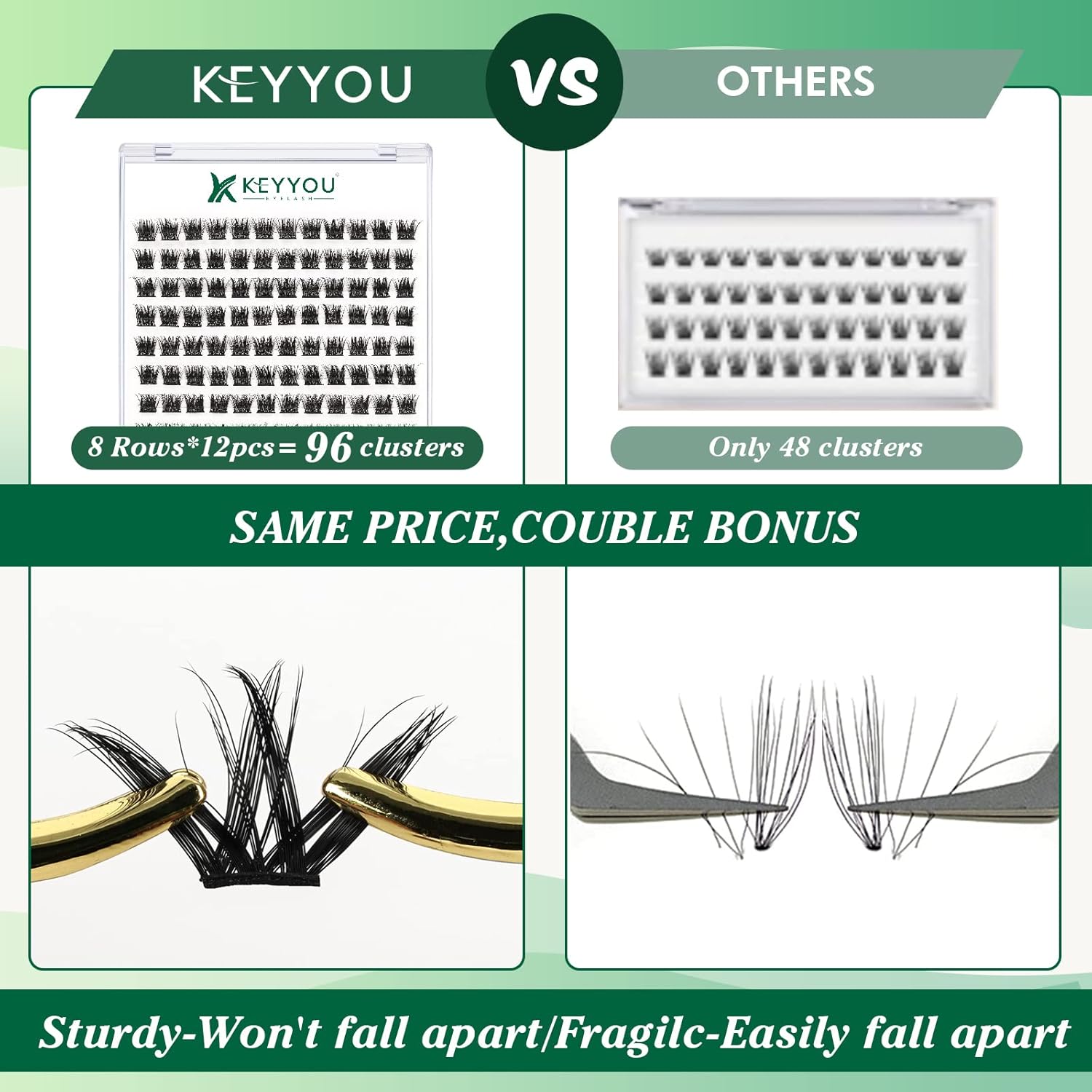 • 【Soft&Comfortable】KEYYOU lash cluster are made of imported materials,the stem line is thinner and softer, the eyelash cluster are lighter and more comfortable to wear.96 clusters in one tray ,more cost-effective.