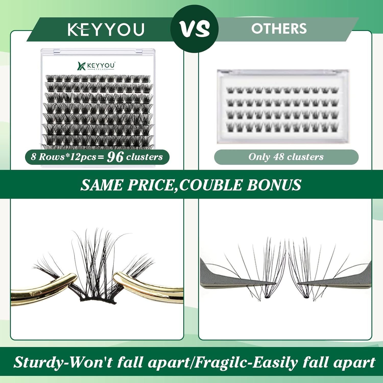 • 【Soft&Comfortable】KEYYOU lash cluster are made of imported materials,the stem line is thinner and softer, the eyelash cluster are lighter and more comfortable to wear.96 clusters in one tray ,more cost-effective.