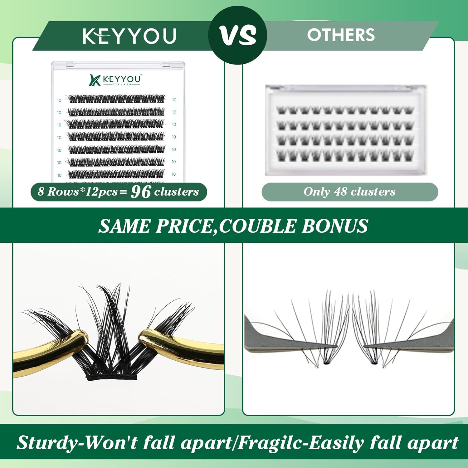 • 【Soft&Comfortable】KEYYOU lash cluster are made of imported materials,the stem line is thinner and softer, the eyelash cluster are lighter and more comfortable to wear.96 clusters in one tray ,more cost-effective.