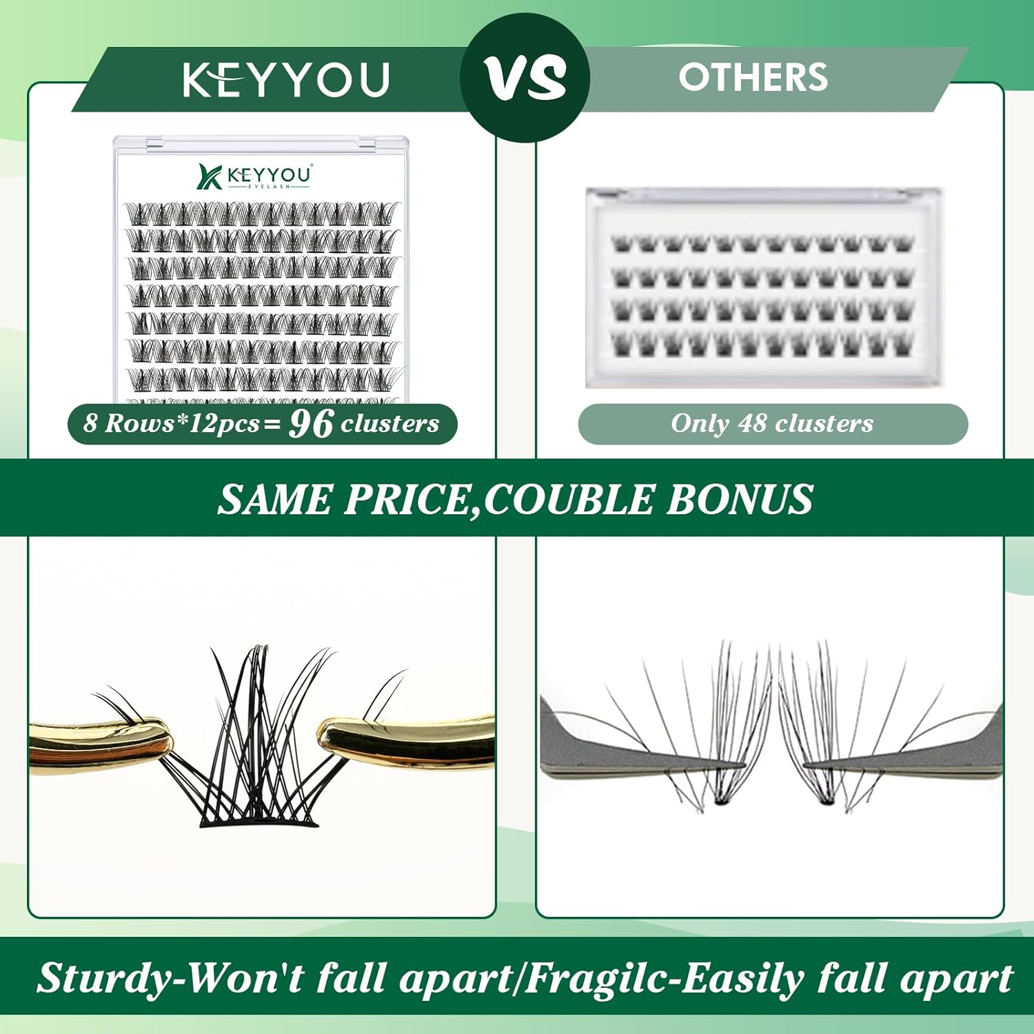 • 【Soft&Comfortable】KEYYOU lash cluster are made of imported materials,the stem line is thinner and softer, the eyelash cluster are lighter and more comfortable to wear.96 clusters in one tray ,more cost-effective.