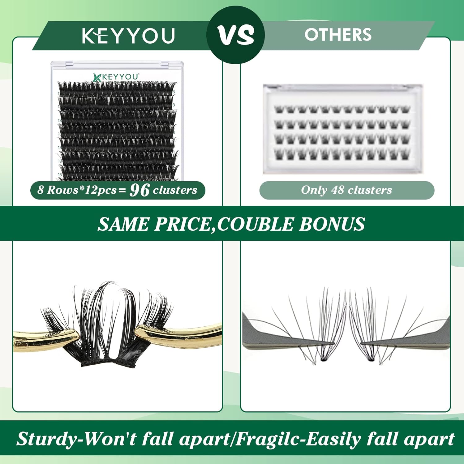 • 【Soft&Comfortable】KEYYOU lash cluster are made of imported materials,the stem line is thinner and softer, the eyelash cluster are lighter and more comfortable to wear.96 clusters in one tray ,more cost-effective.