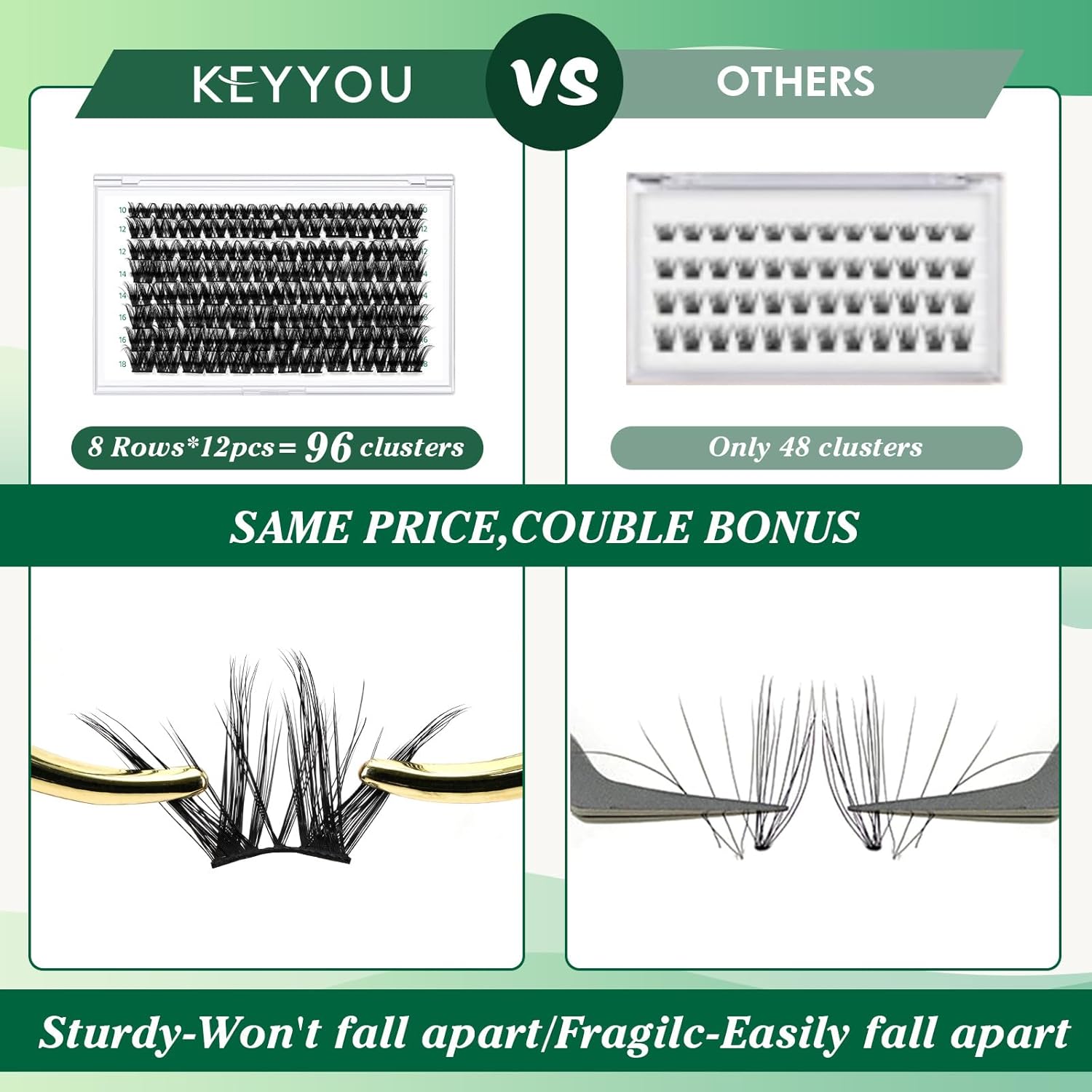 • 【Soft&Comfortable】KEYYOU lash cluster are made of imported materials,the stem line is thinner and softer, the eyelash cluster are lighter and more comfortable to wear.96 clusters in one tray ,more cost-effective.