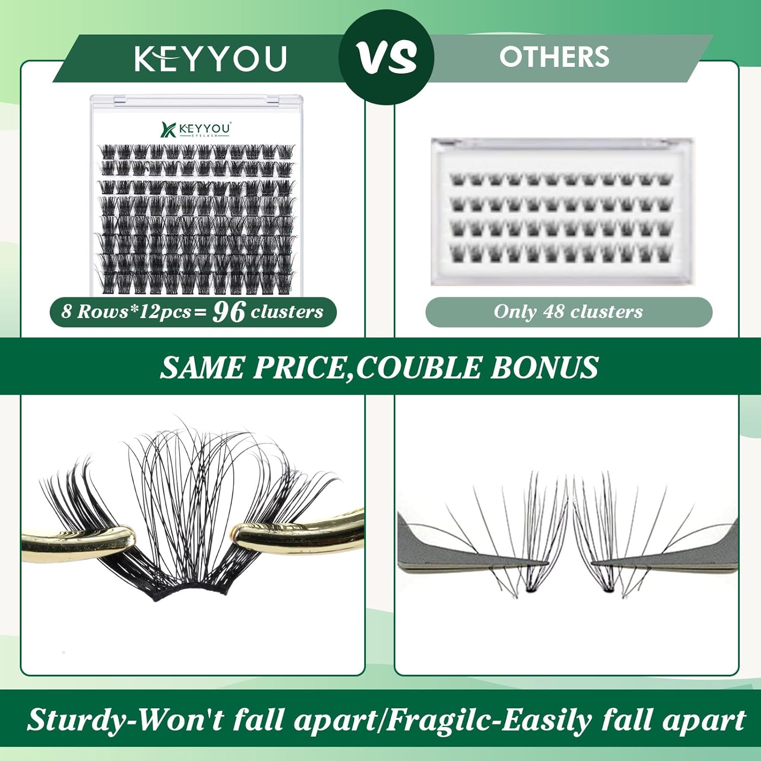 • 【Soft&Comfortable】KEYYOU lash cluster are made of imported materials,the stem line is thinner and softer, the eyelash cluster are lighter and more comfortable to wear.96 clusters in one tray ,more cost-effective.