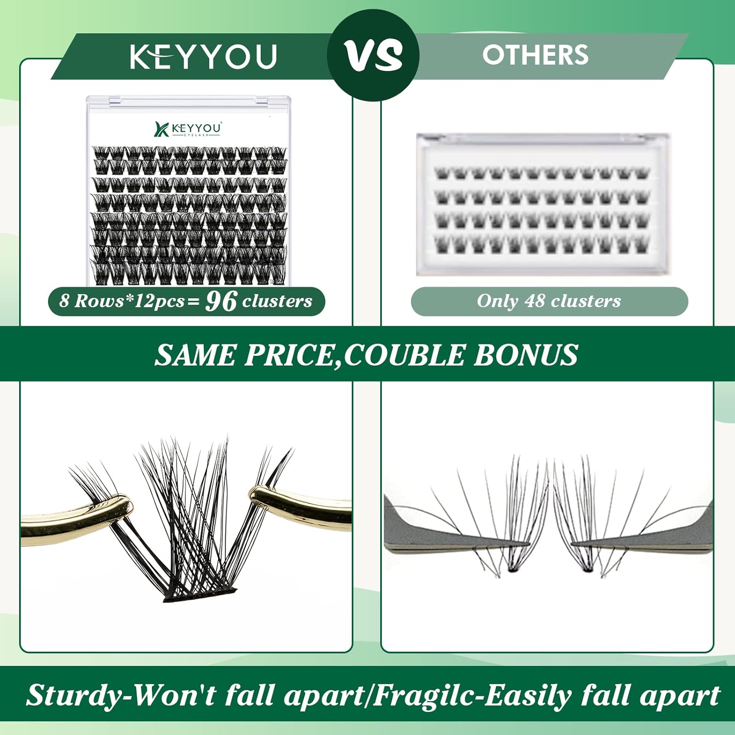 • 【Soft&Comfortable】KEYYOU lash cluster are made of imported materials,the stem line is thinner and softer, the eyelash cluster are lighter and more comfortable to wear.96 clusters in one tray ,more cost-effective.