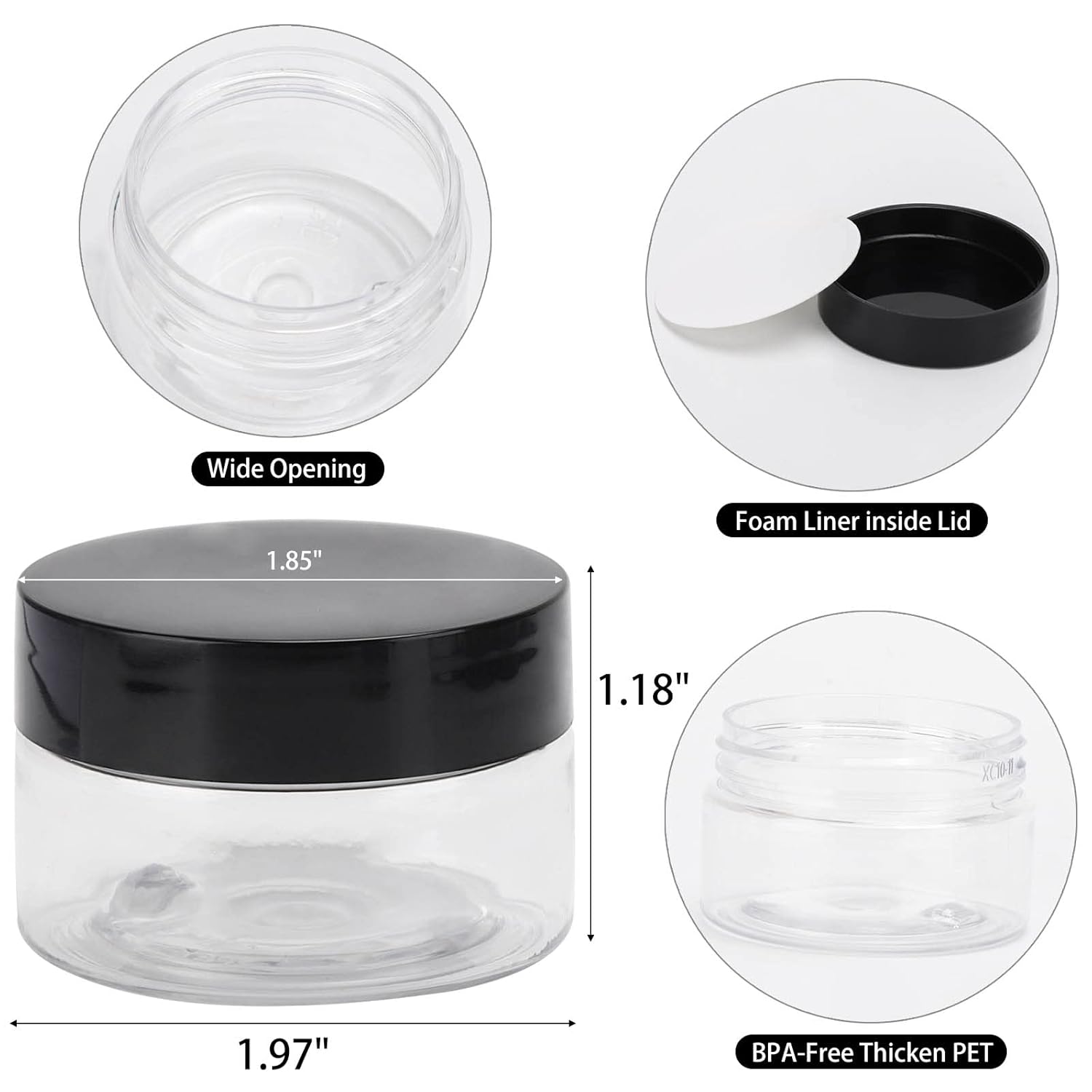 • 50 pieces of refillable cosmetic jars with lid. Capacity:30g/ 1oz . Made of PET plastic, black plastic cover with leak-proof gasket