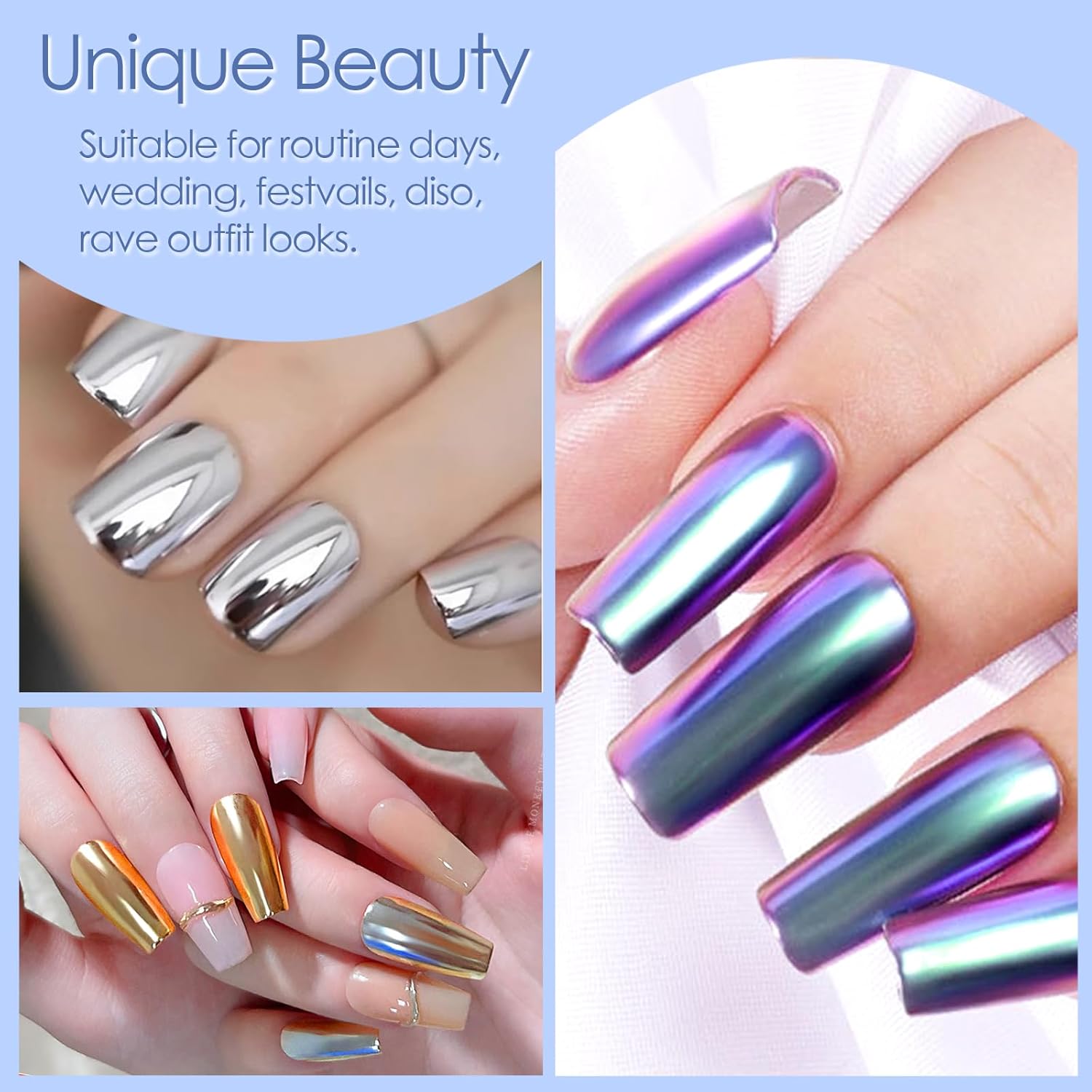 • 【Amazing Nail Chrome Powder】Allstarry chrome powder set(gold and silver chrome nail powder & chameleon chrome powder) can create shining chrome effects when rubbing it on nails. The rub on gold chrome nail powder is suitable for applying on gel polish nails, builder gel nails, dip acrylic powder manicures, and acrylic press-on nails. And the gold nail chrome powder has different results over different color nails. Try chrome powder for nails and meet your styles.