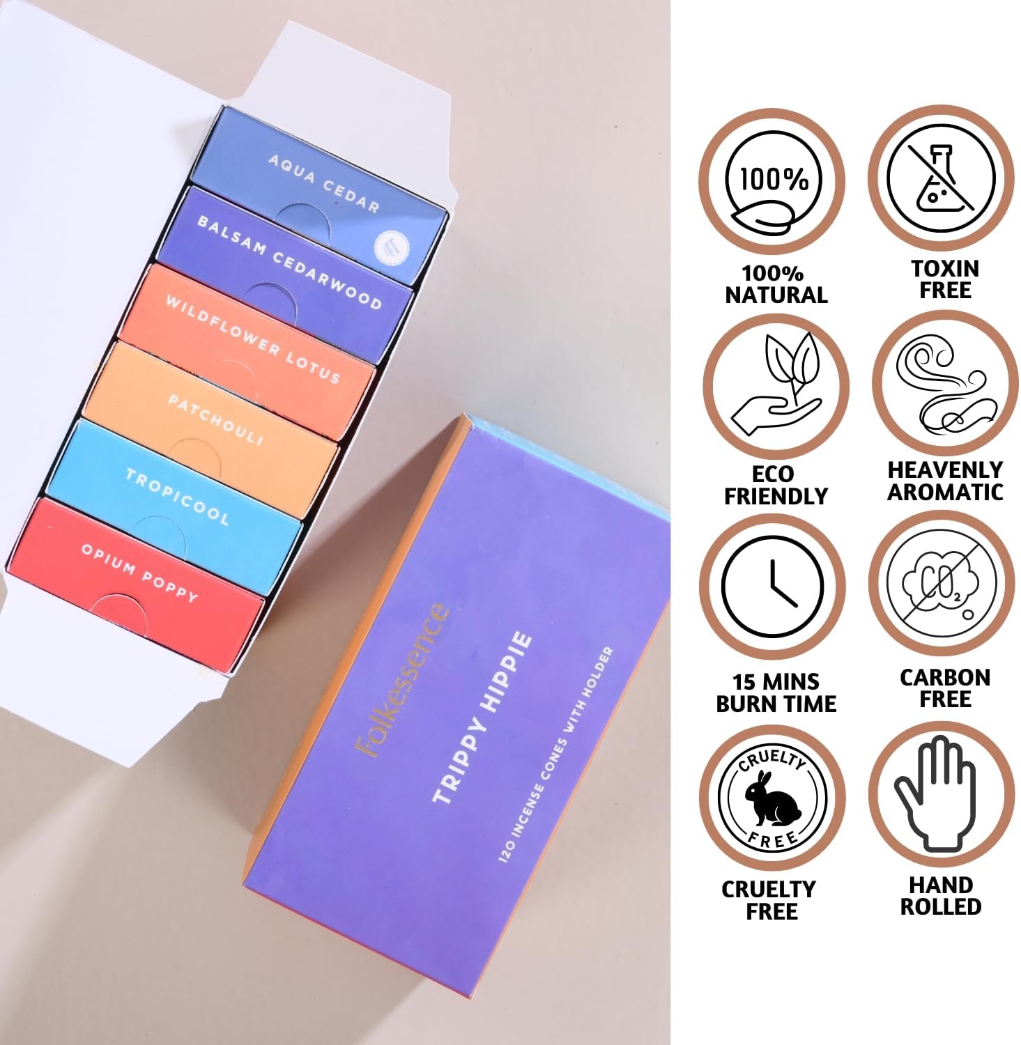 Folkulture Incense Cones Scented | Set of 6 Fragrances (120 Cones) with Incense Cones Holder | Opium Poppy Patchouli Incenses | Mango Pineapple, Balsam Cedarwood | Organic Variety Pack Inscents