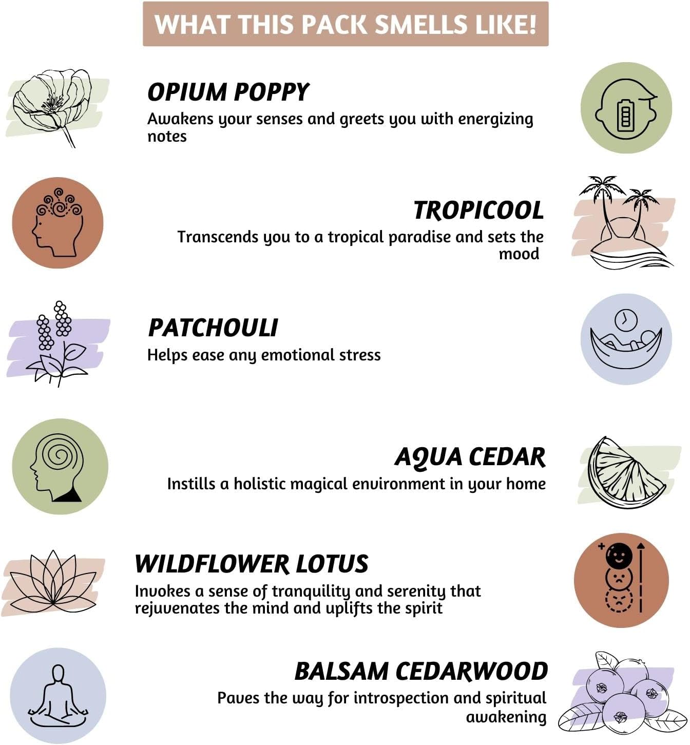 • Scent : Aqua Cedar, Balsam Cedarwood, Opium Poppy, Patchouli, Tropicool, Wildflower Lotus