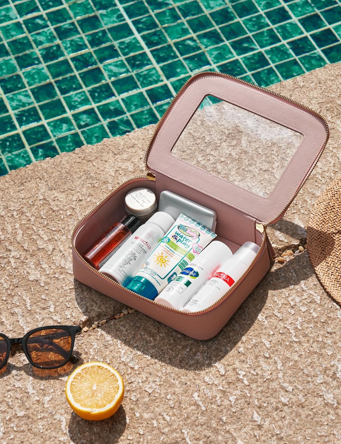• [Premium Material and Durability] – The clear cosmetic case, both the exterior and interior, is crafted from high-grade saffiano faux leather, which is highly scratch resistant, durable and exceptionally easy to keep clean. It features a smooth zipper for secure closure, and elegant light gold metal hardware accents, adding a luxurious and sophisticated touch to the bag's overall design.