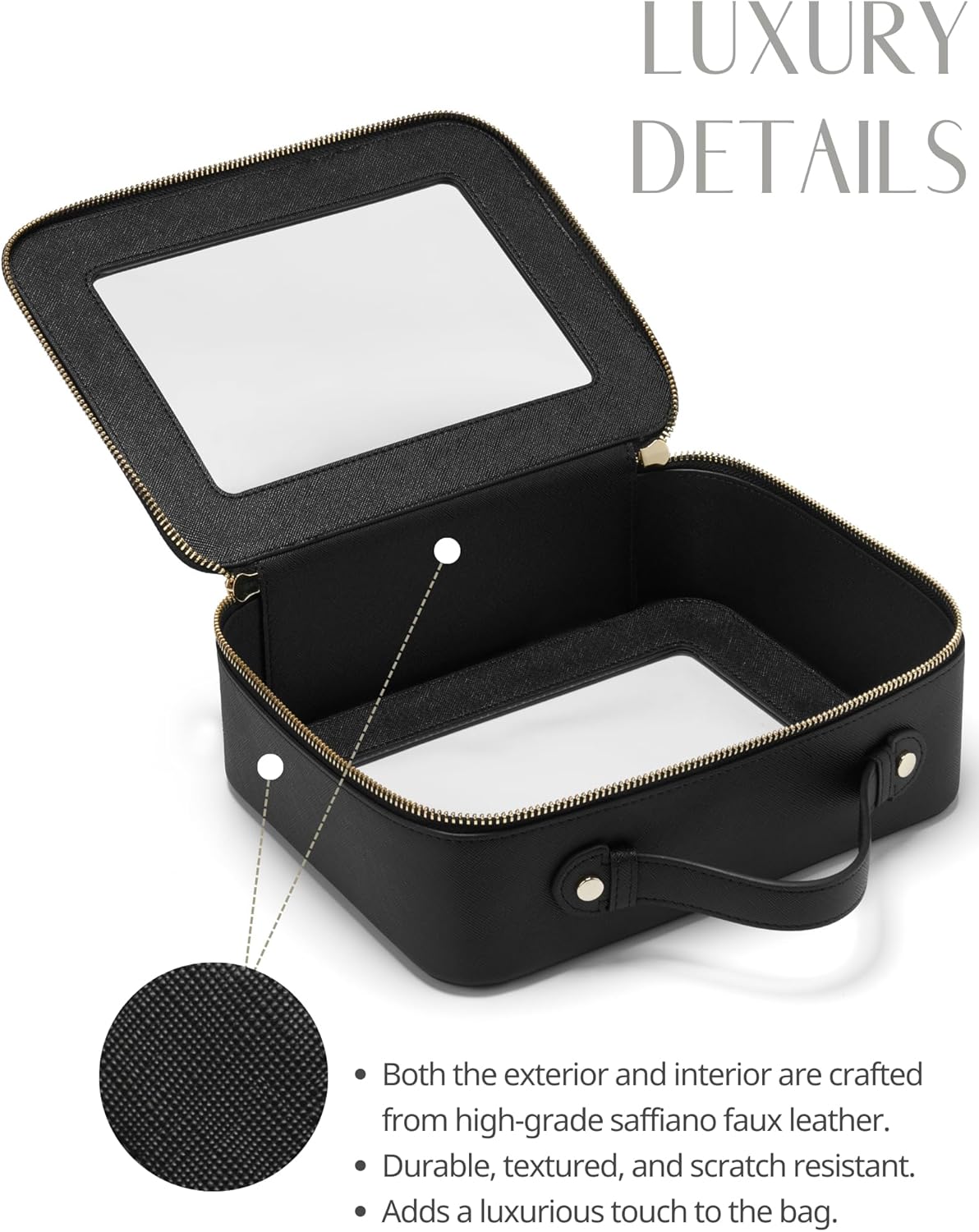 • [Premium Material and Durability] – The clear cosmetic case, both the exterior and interior, is crafted from high-grade saffiano faux leather, which is highly scratch resistant, durable and exceptionally easy to keep clean. It features a smooth zipper for secure closure, and elegant light gold metal hardware accents, adding a luxurious and sophisticated touch to the bag's overall design.