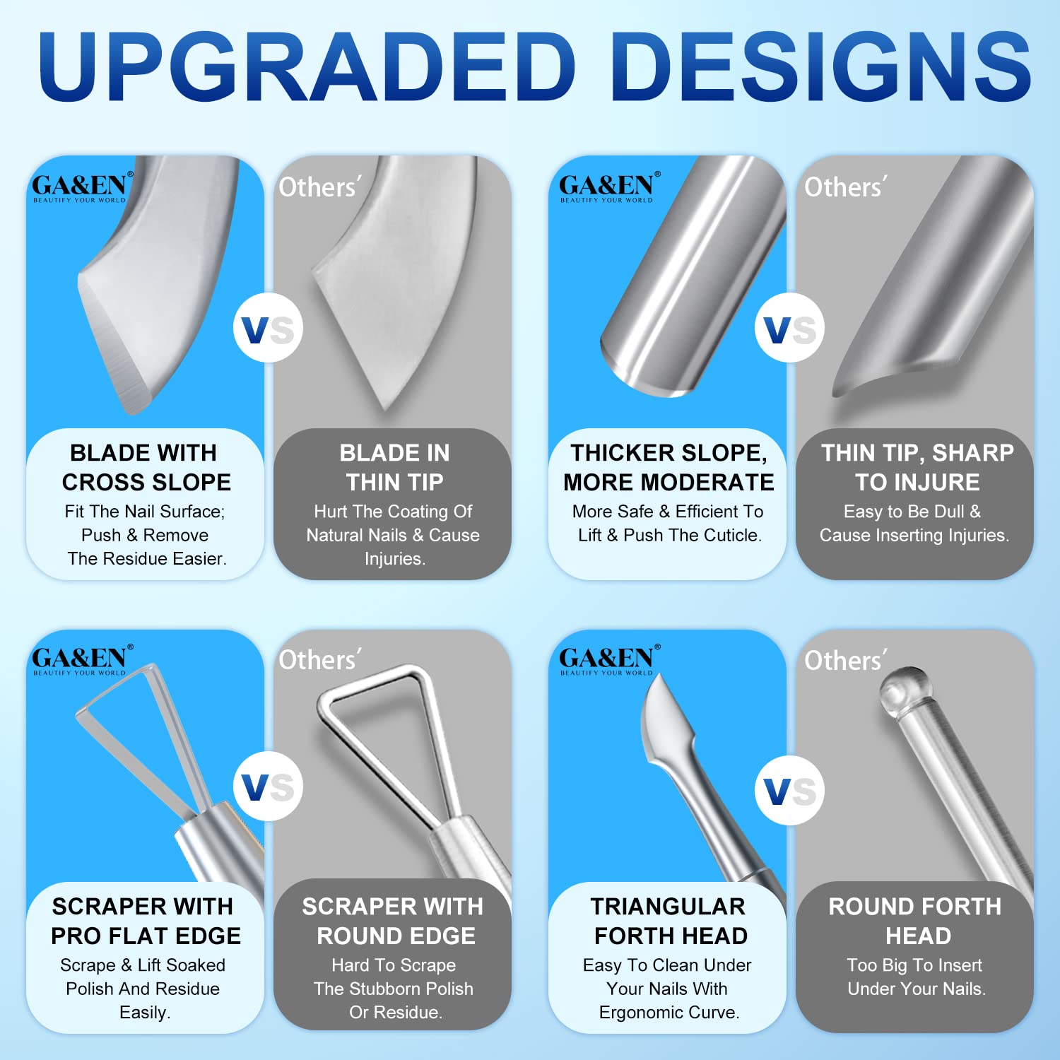 • FOUR WELL-DESIGNED HEADS: The spoon head is curved ergonomically with thicker slope, which avoids causing injury when pushing the cuticle. The triangular tip is made with thin and sharp edge, which can remove the gel polish cuticle easily and thoroughly with less scraping on nail bed. The curved-blade head is a good helper to clean up the residue along the cuticle line. The pointy head helps to remove the dead skin under your nails