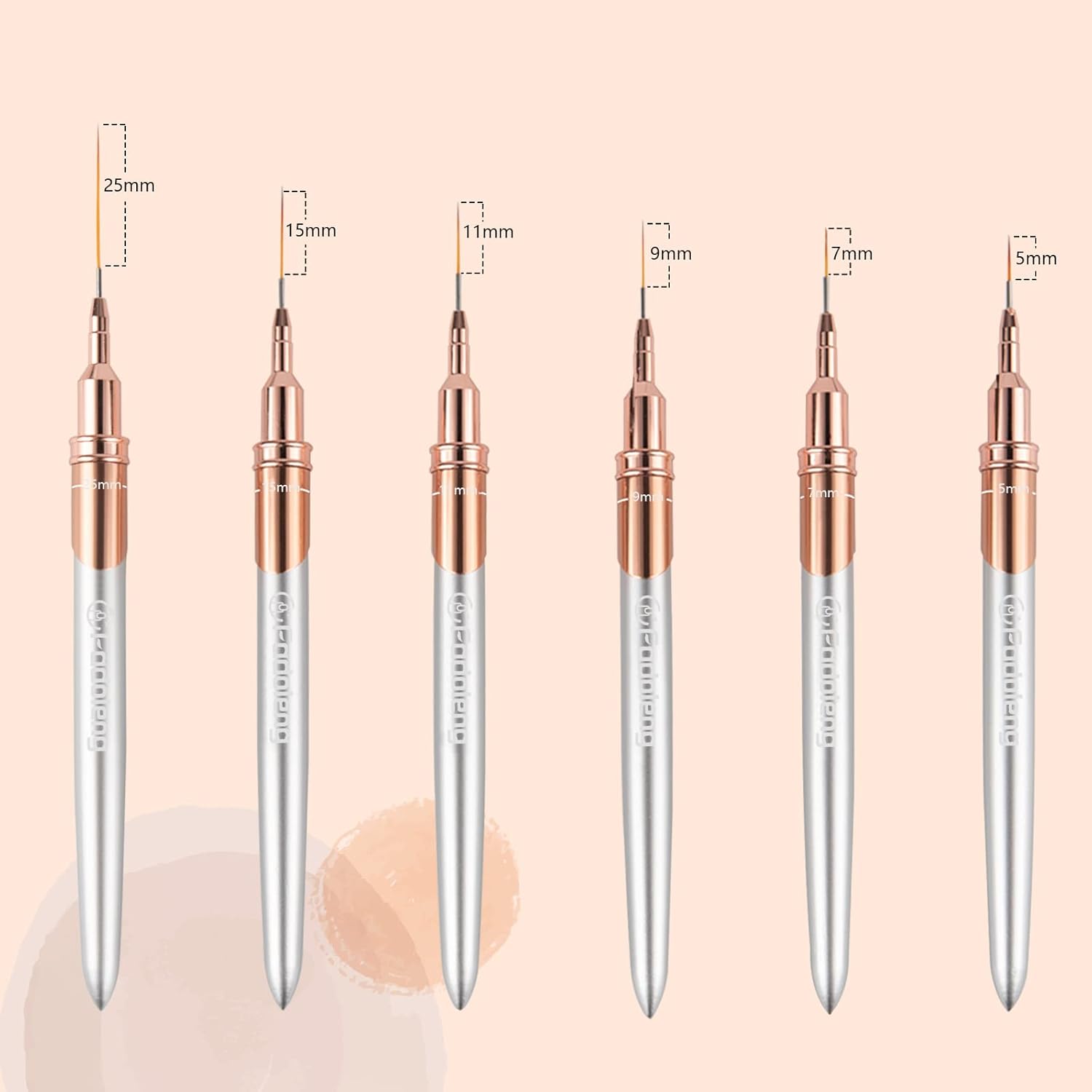 Liner Brush for Nails, 6Pcs Thin Nail Art Brushes Professional Nail Detail Brush for Gel Polish Sizes 5/7/9/11/15/25mm (Silver and Golden)