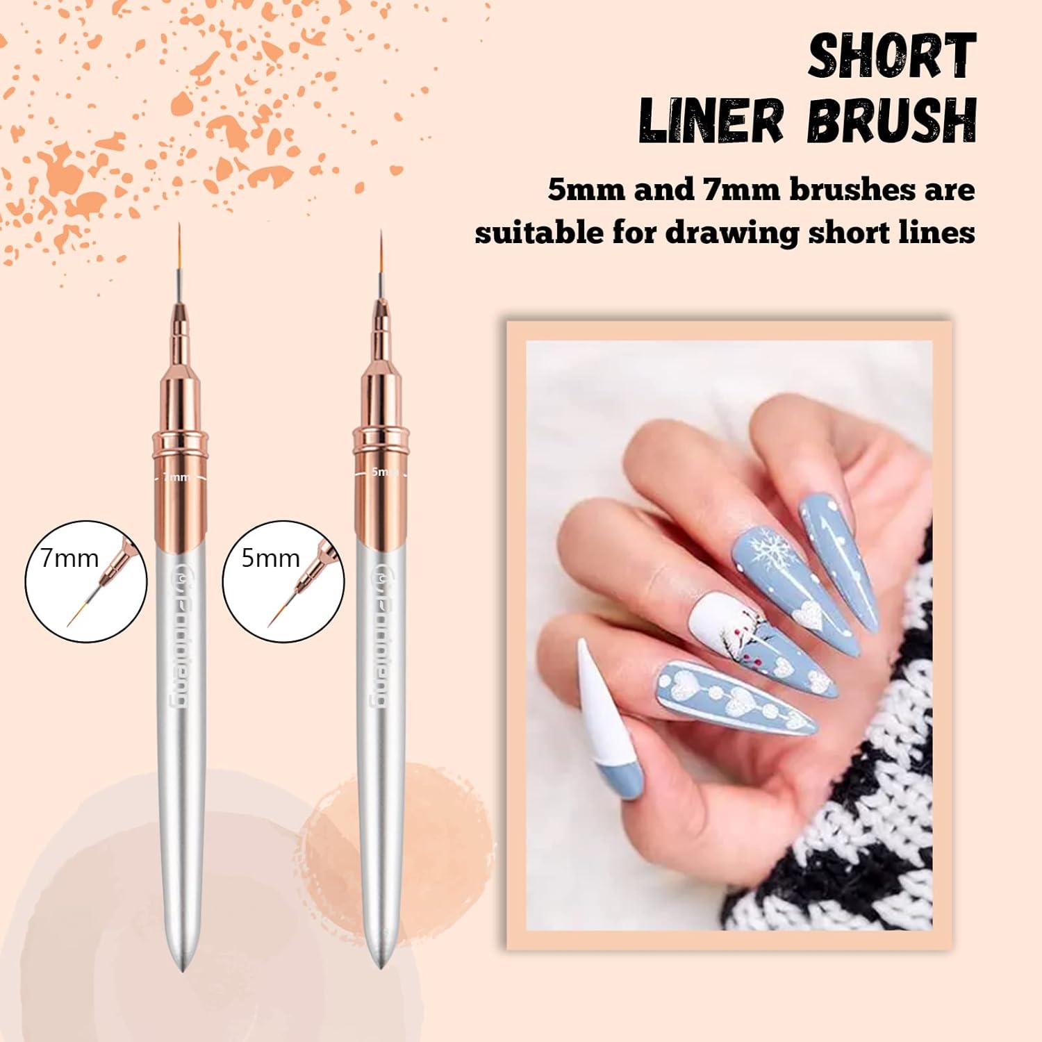 • High Quality - The head of the nail art brush is made of high-quality fibers, soft but non-deformation. The handle part of the nail liner brush is made of lightweight metal, durable and suitable for daily use. Each with a cap to protect the nail art liner brush from dust and forking