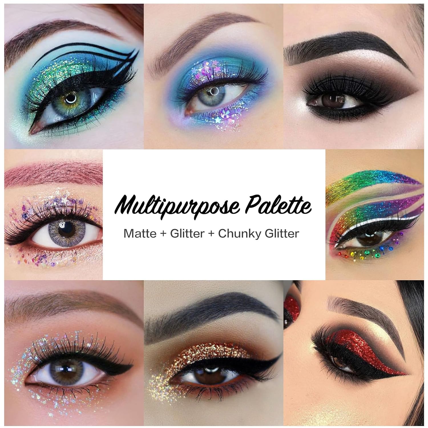 • For optimal results with this versatile palette, it's recommended to use a glitter primer or glue (note: the 6 chunky glitter shades don't require primer). These vibrant glitter eyeshadows are both waterproof and long-lasting. Beyond the eyes, this palette's shades can be used for nail, body, and hair art. However, be cautious with the small sequins; avoid getting them in your eyes or swallowing them.