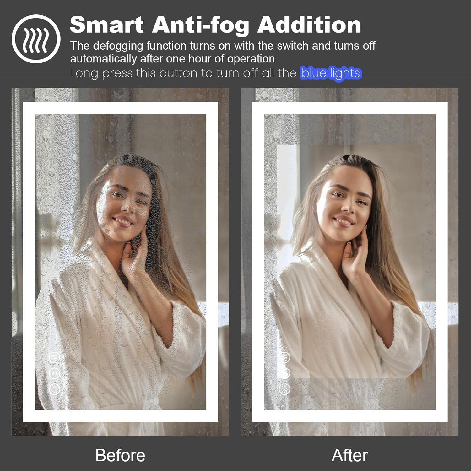 • [Anti-fog]: After a few minutes of opening the defogger, the heater in the mirror will disperse the fog from the center to sides, the mirror will still reflect clearly in the bathroom surrounded by hot air; It will turn on with the power on and automatically turns off after 1 hour