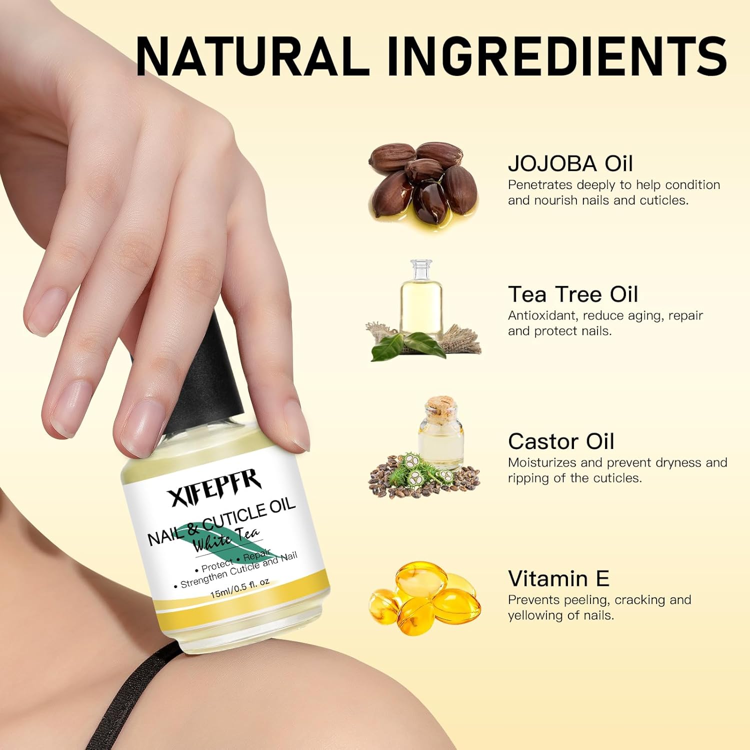 • Nail Cuticle Oil: A high quality nourishing nail oil enriched with a variety of nutrients for cuticle care to soften, moisturize and repair cuticles, effectively improving dry, cracked and brittle nails and promoting nail and cuticle renewal. Apply to the cuticle of nails and massage gently to promote absorption.