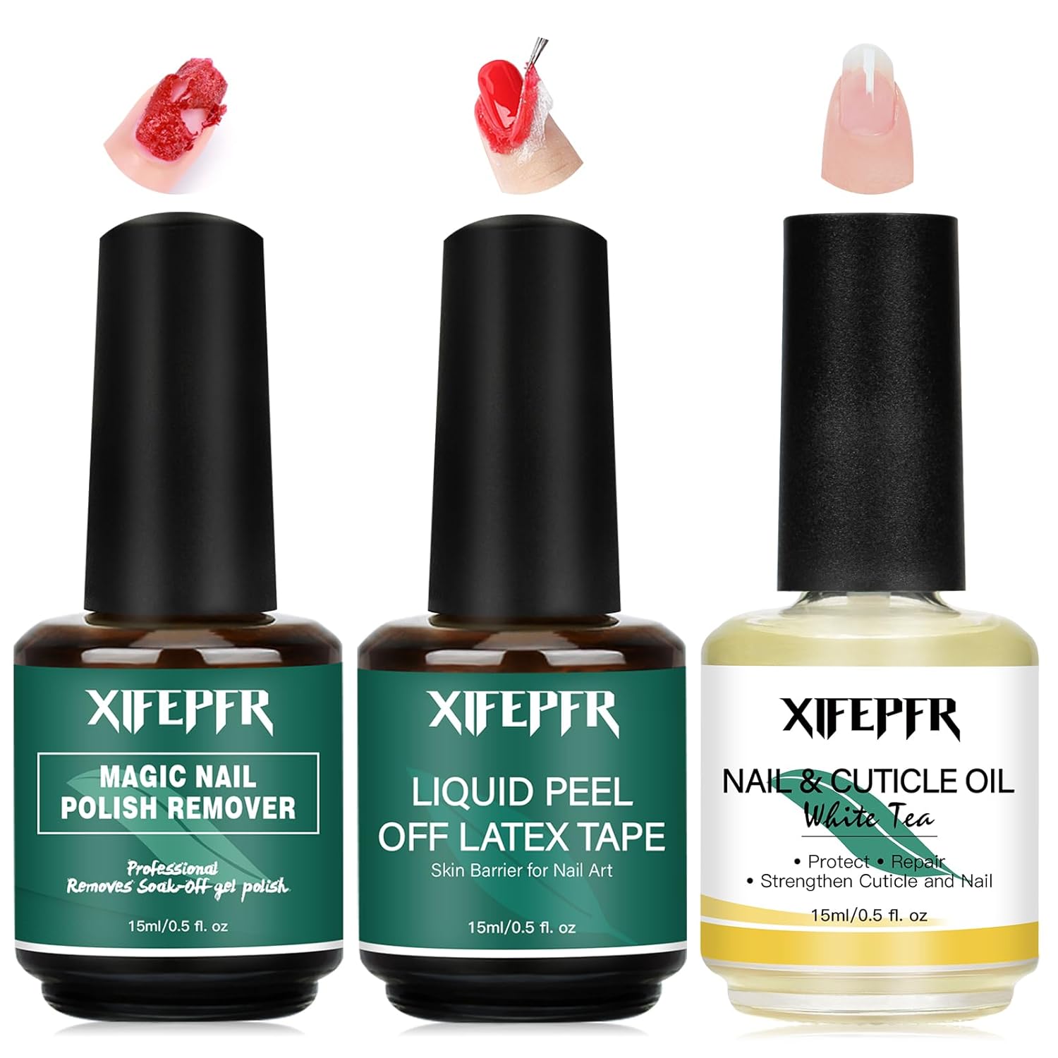 • Gel Polish Remover Kit: Our kit includes 1pcs gel nail polish remover, 1pcs liquid latex for nails and 1pcs cuticle oil. 3-in-1 gel remover kit helps you quickly remove gel nail polish without damage nails, cuticle oil nourish and repair your nail cuticles, leaving your nails ready for the next manicure. Quick & easy gel polish remover set.
