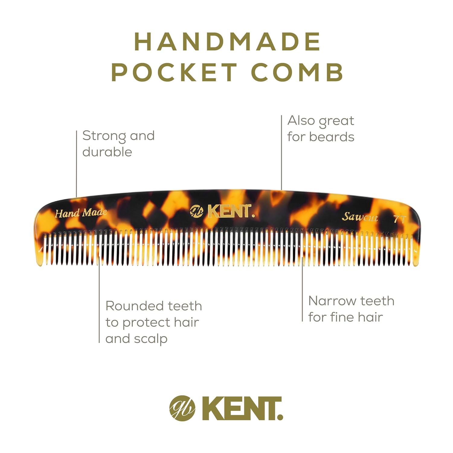 Kent 7T TY Handmade All Fine Tooth Pocket Comb for Men, Hair Comb Straightener for Everyday Grooming Styling Hair, Mustache and Beard, Use Dry or with Balms, Saw Cut and Hand Polished, Made in England