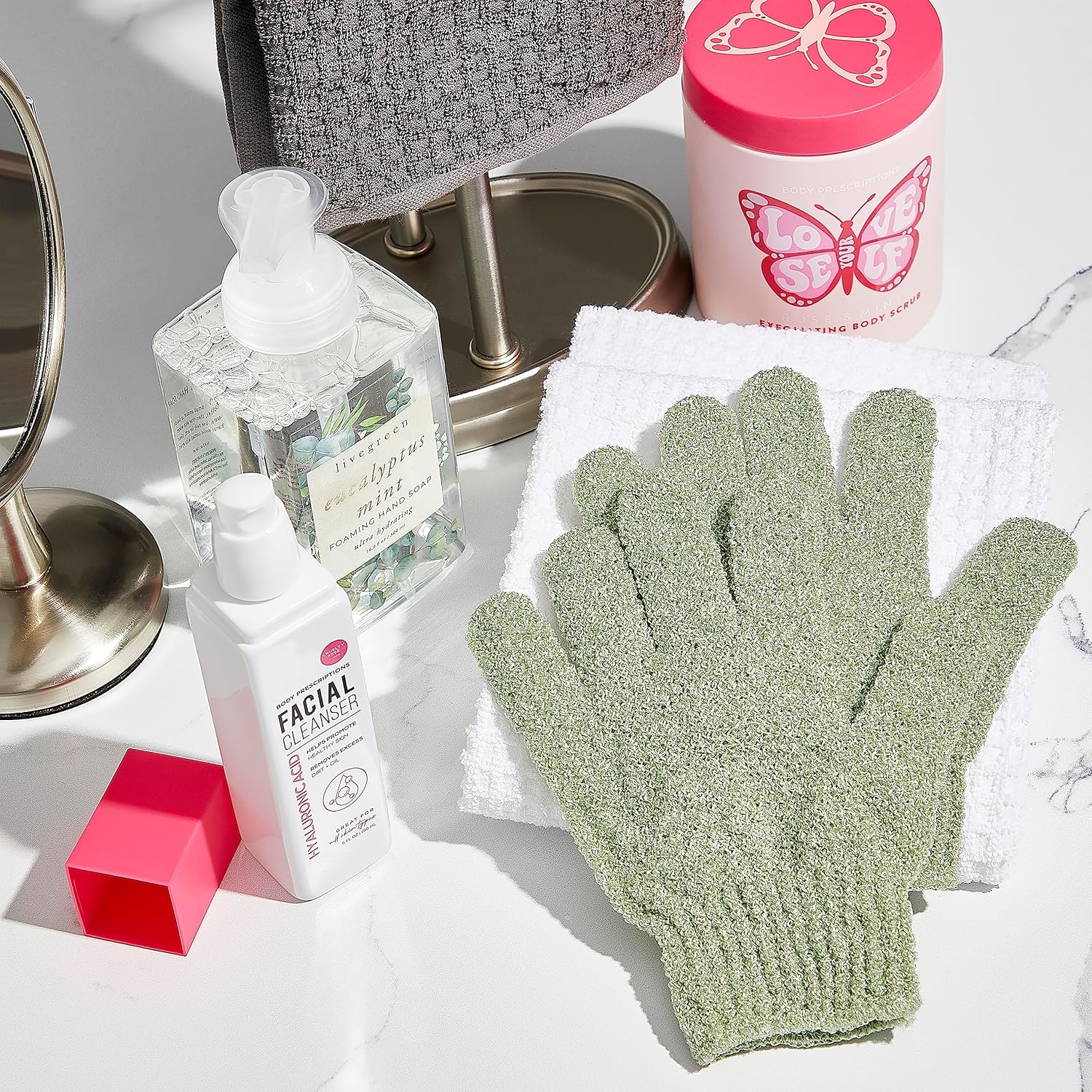 • To Use: In the shower or bath, add body wash, scrub, or soap. Dampen your gloves with water and cleanser and put the gloves on. Wash and exfoliate your body at the same time for clean and ultra soft skin.