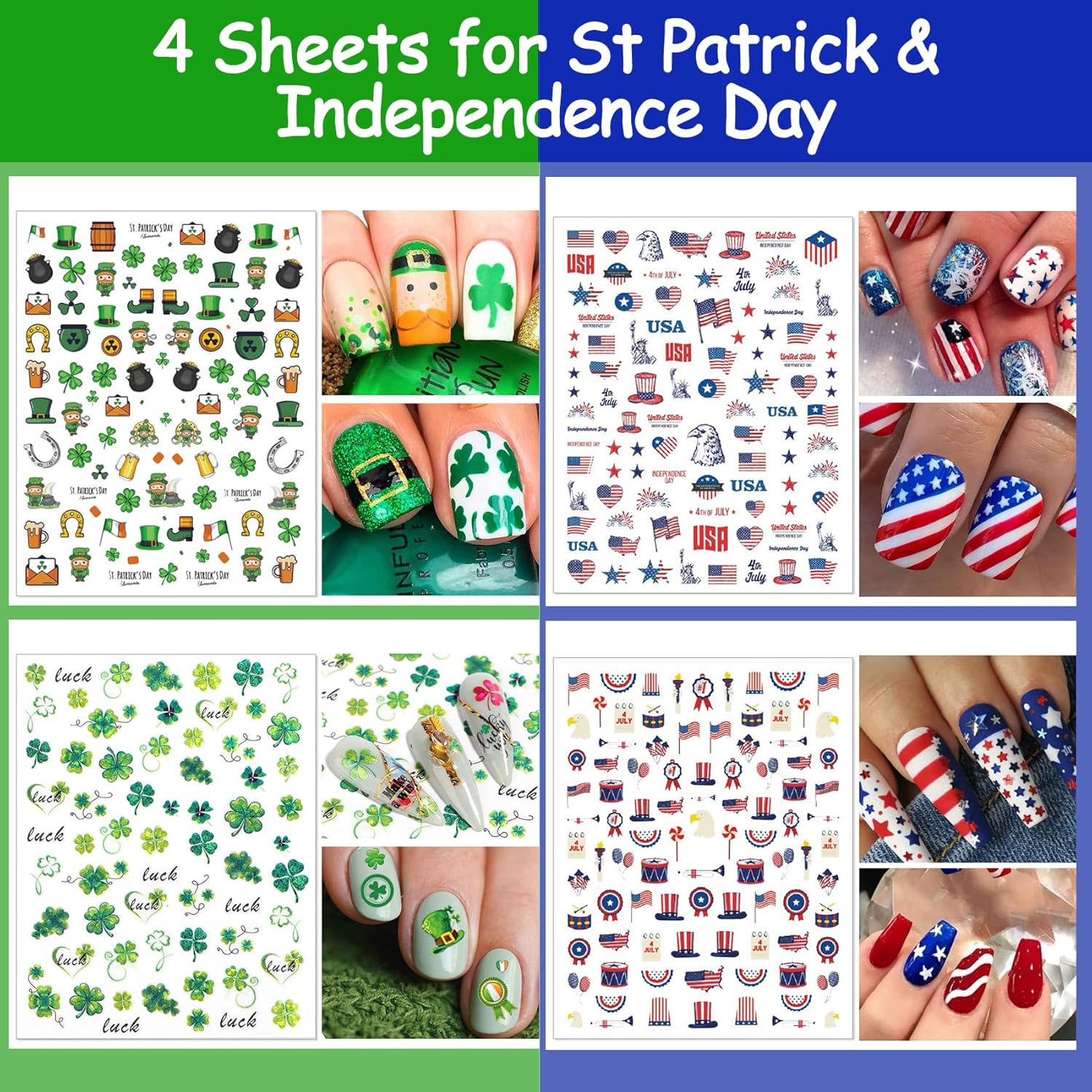 • A Set for All Year: You will get 20 sheets for all year round seasonal nail stickers for all holidays. 4 Sheets for each festival: Halloween, Christmas Thanksgiving Day, Valentine's Day, and 2 sheets for St. Patrick's Day and 2 sheets for 4th of July. Includes all sorts of seasonal classic theme: Pumpkins, Spider Web , Santa Claus, Snowflake, Maple leaves, Turkey, Love, heart, Shamrock, American Flag, USA etc. Make you have a special nail art all year round!